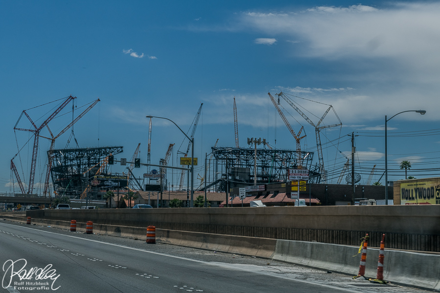 Auf dem Weg am I15 fieberhafte Bautätigkeit. Ein großes Stadion entsteht.