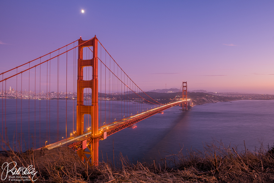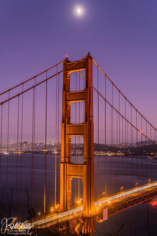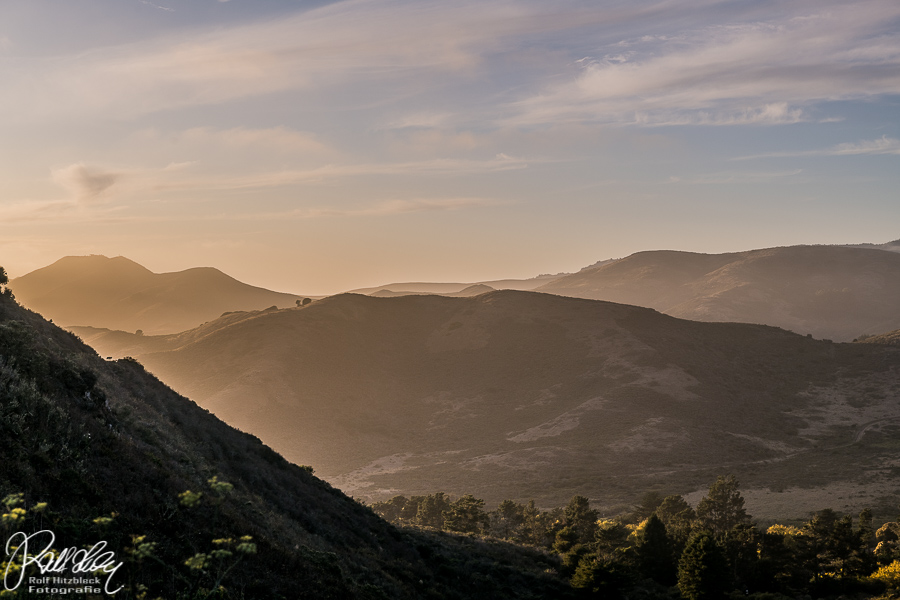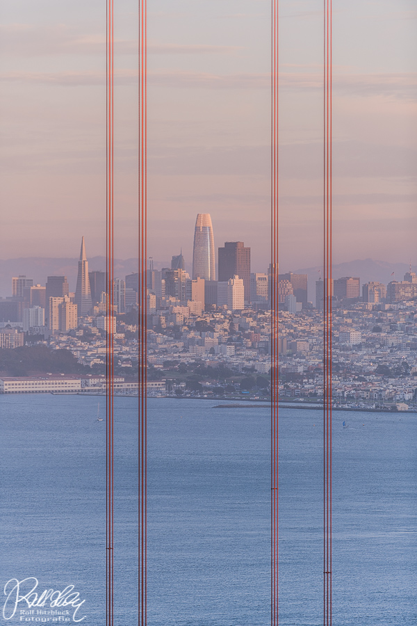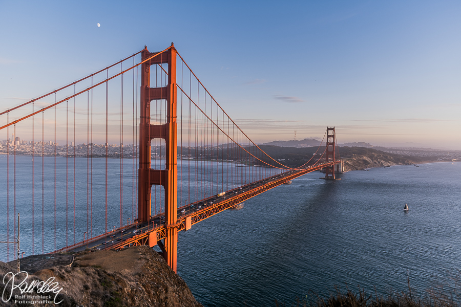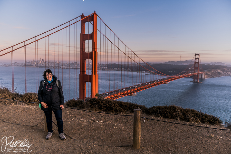 Dann ging es zum letzten Tagesziel, der Golden Gate Brücke. Hier wollten wir vom Golden Gate Park den Sonnenuntergang erleben und noch ein paar Nightshots machen. Der direkte und kurze Weg war leider versperrt und wir mussten einen ziemlichen Umweg durch den Park fahren, um zum Aussichtspunkt zu gelangen. Die Straßen waren besonders aufbereitet (mit vielen Parkplätzen), vermutlich um die Besucher der jetzt stattfindenden Fleetweek aufnehmen zu können. Der Wind pfiff heftig und wir waren froh, unsere dicken Jacken mitgenommen zu haben.