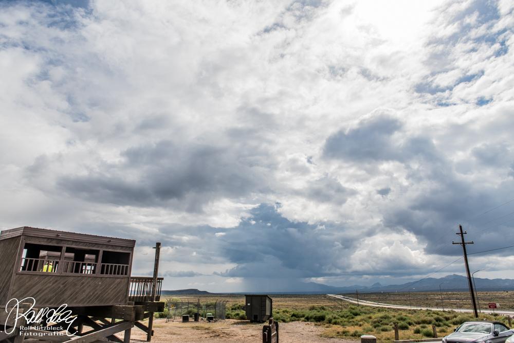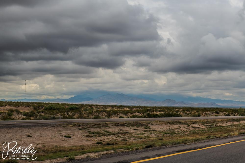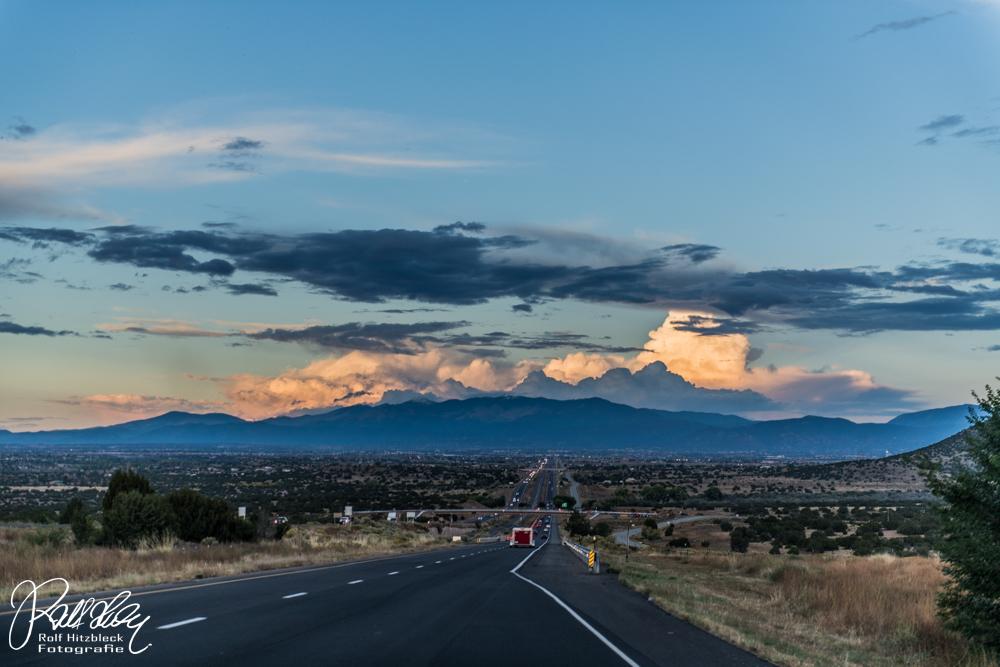 Jetzt wieder auf die Autobahn und noch eine knappe Stunde bis Santa Fe zu fahren. Vor uns türmte sich der Thompson Peak auf, unterstützt von gewaltigen Wolkengebilden. Manchmal konnte man gar nicht unterscheiden, ob es sich um Gebirge oder von der Sonne weniger angestrahlte Wolken handelte.