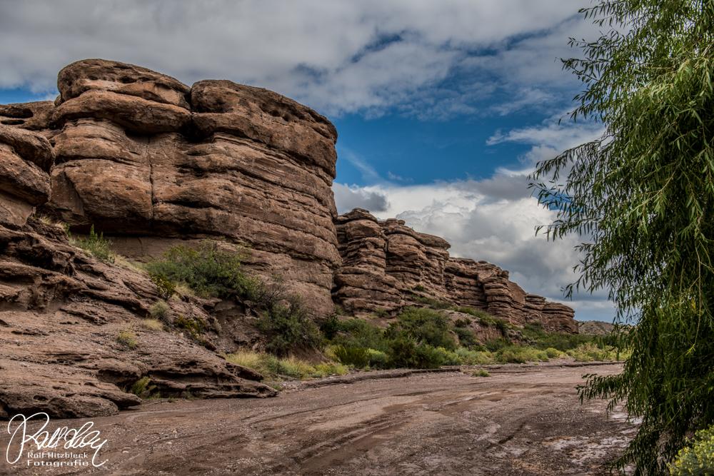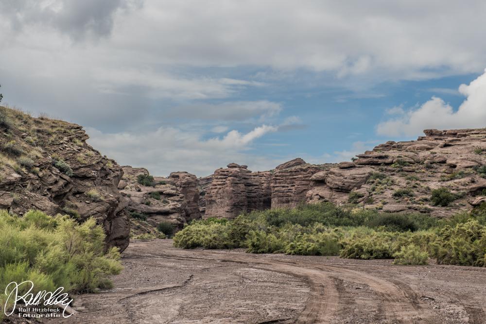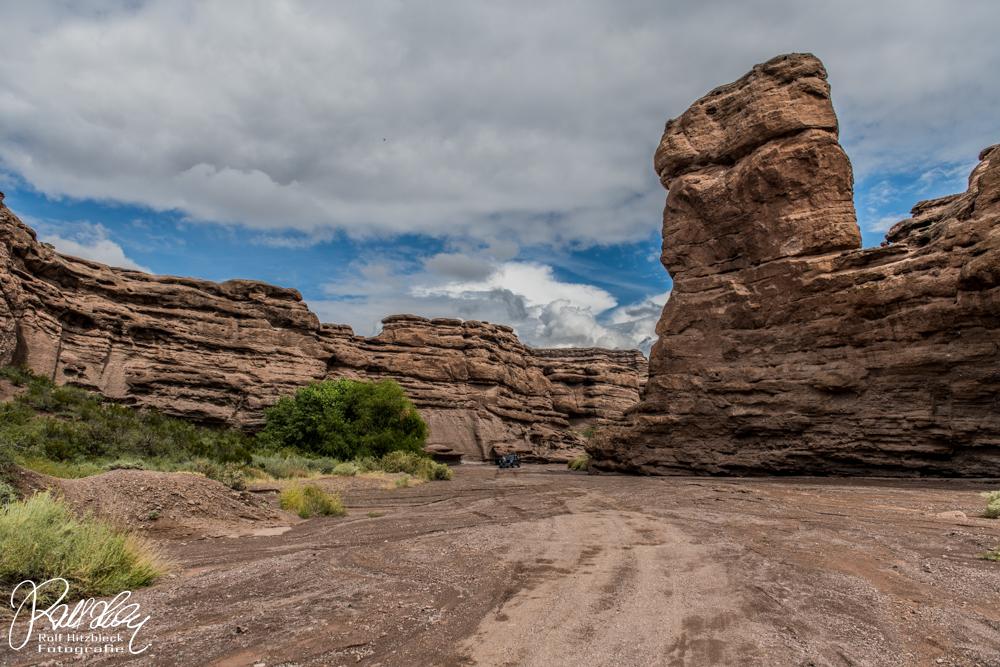 Reifenspuren zeugten davon, dass hier vor uns schon jemand hergefahren war. Es war auch nicht matschig, so dass (noch) keine Gefahr bestand, sich festzufahren. Nach der angegebenen Meilenzahl kamen tolle Felsen ins Blickfeld und wir stoppten inmitten des Canyons im Flussbett.