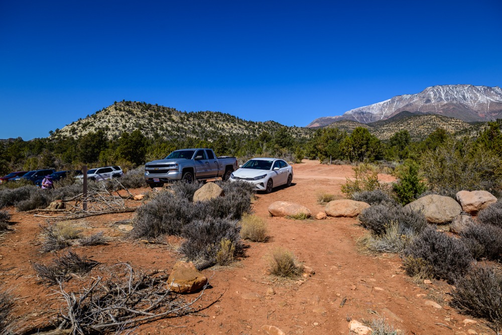 Vom Parkplatz aus geht es los. Alltrails hat ca. 5 km für die gesamte Strecke veranschlagt, davon gehen 1 bis 2 km für den Anmarsch drauf. Sechs weitere Autos stehen in den „Parkbuchten“, wir werden also nicht alleine sein.