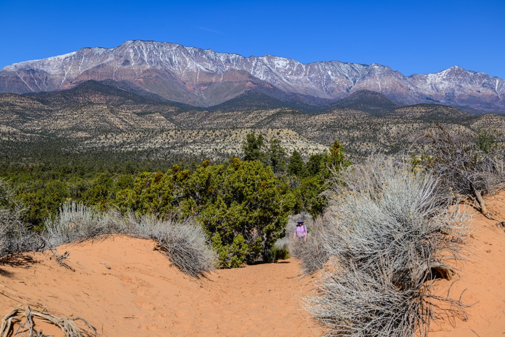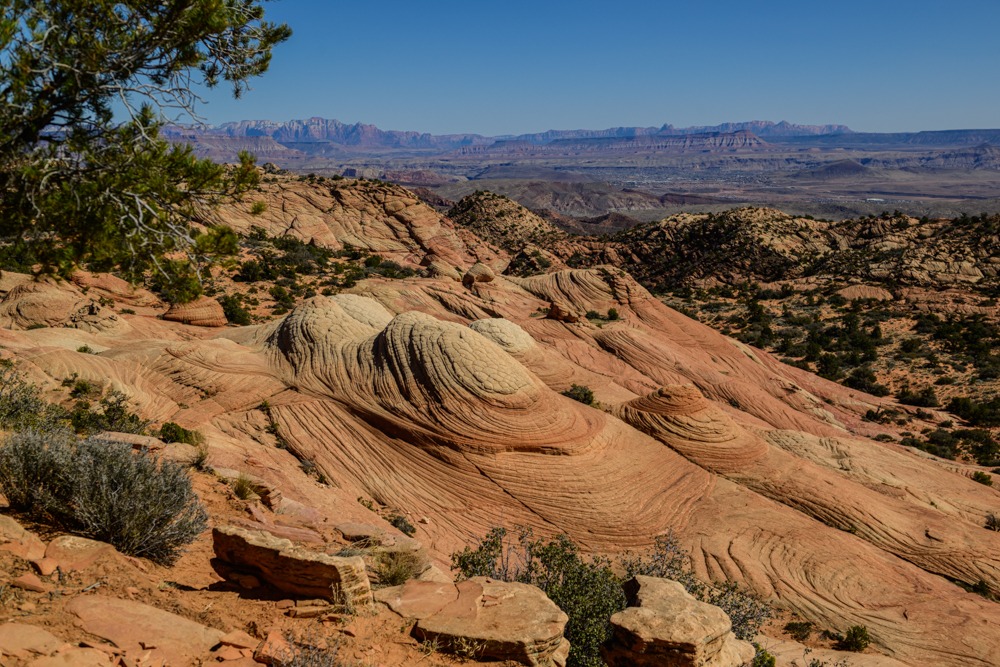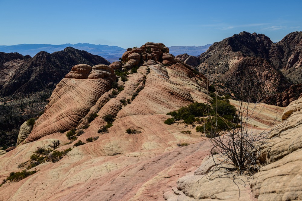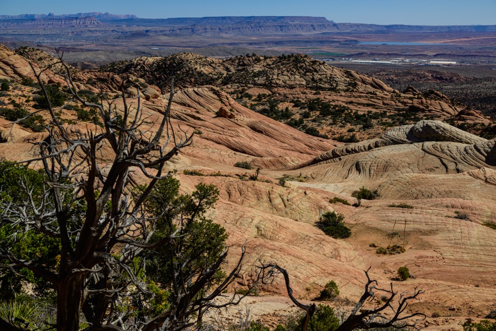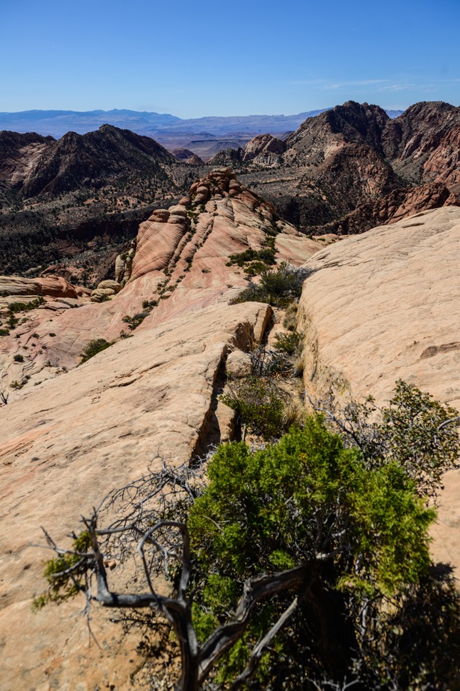 Zum Standardprogramm an Wanderungen in St. George gehört auch der Besuch von Yant Flat. Dies ist eine Felsenlandschaft, welche im Endeffekt direkt nördlich der Stadt liegt. Leider ist sie nicht auf direktem Weg zu erreichen. Wir fahren dazu auf dem Interstate 15 nach Norden, um bei der Ausfahrt Leeds den Weg in die Berge zu nehmen. Nach wenigen Meilen durch ein sehr schönes neues Wohngebiet (tolle Häuser, ehrlich) endet der Asphalt und wir hoppeln ca. 8 Meilen auf der Danish Ranch Road (031) bis zum Parkplatz vom Trailhead. Google Maps hatte uns als kürzere Route die Fahrt aus westlicher Richtung vorgeschlagen, aber von anderen Besuchern erfuhren wir im Nachhinein, dass sich dieser Teil in wesentlich schlechterem Zustand befindet. Also alles richtig gemacht.