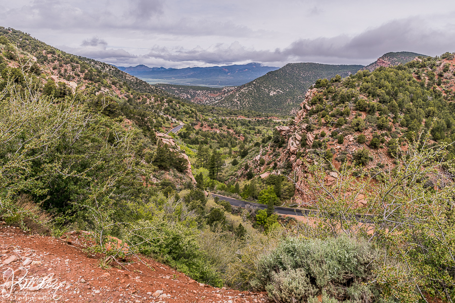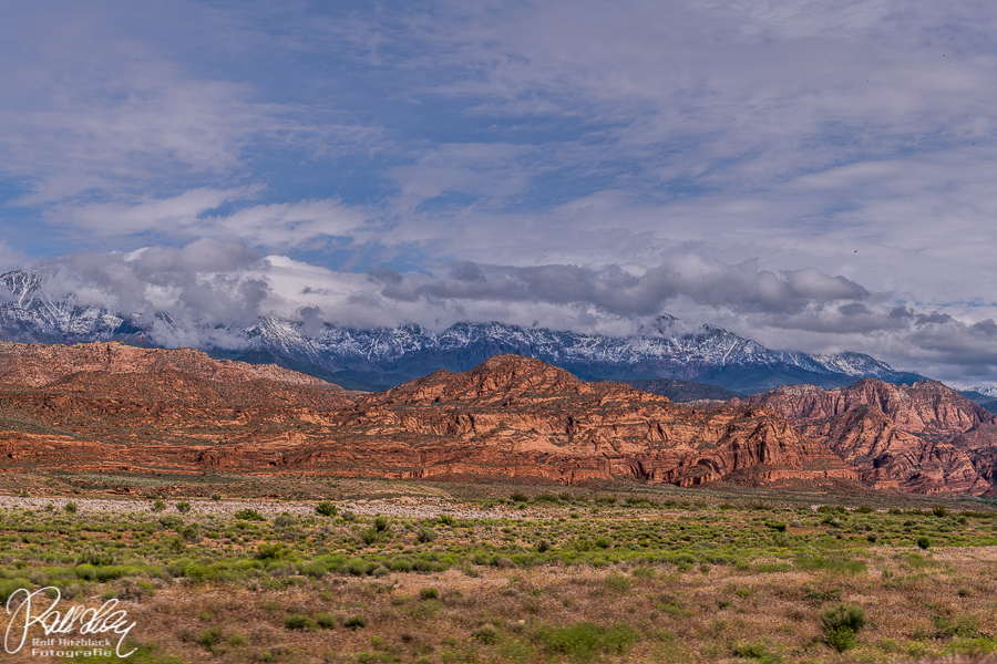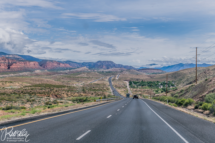 Aber hält uns das vom Reisen ab? Neiiin. Wir bestiegen unseren (immer noch weißen) Pickup und setzten uns auf den Interstate 15 Richtung Norden. Im Sonnenlicht glänzten auf der westlichen Seite die Berge um Silver Reef.