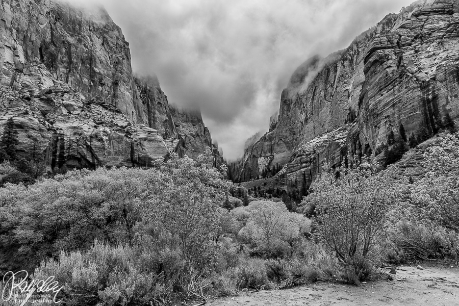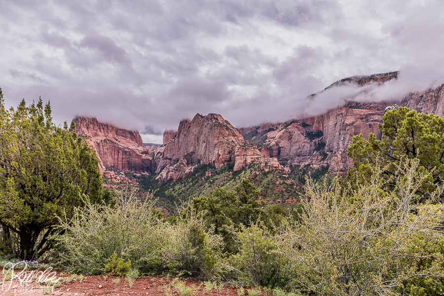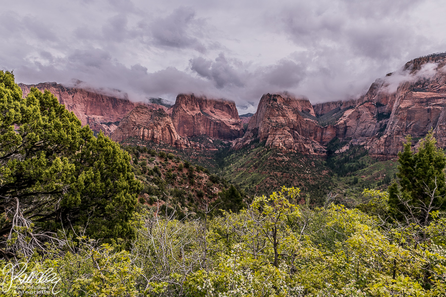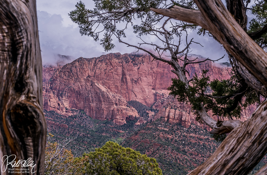 Ca. 40 Meilen ging es Richtung Norden bis zur Kolob Section des Zion National Parks. Der Zion Park hat drei Zugänge. Der am meisten befahrene und bekannte ist der südliche Zugang. Ein weiterer führt zum Lava Point und der dritte zum Kolob Canyon. Dieser liegt in der nordwestlichen Ecke des Parks und war in den letzten Jahren aufgrund umfangreicher Straßenbauarbeiten komplett gesperrt. Am Visitor-Center erstanden wir einen Nationalpark Pass für das nächste Jahr und fuhren in die Berge. Majestätisch ragten die roten Felsen bis in die tief hängenden Wolken.