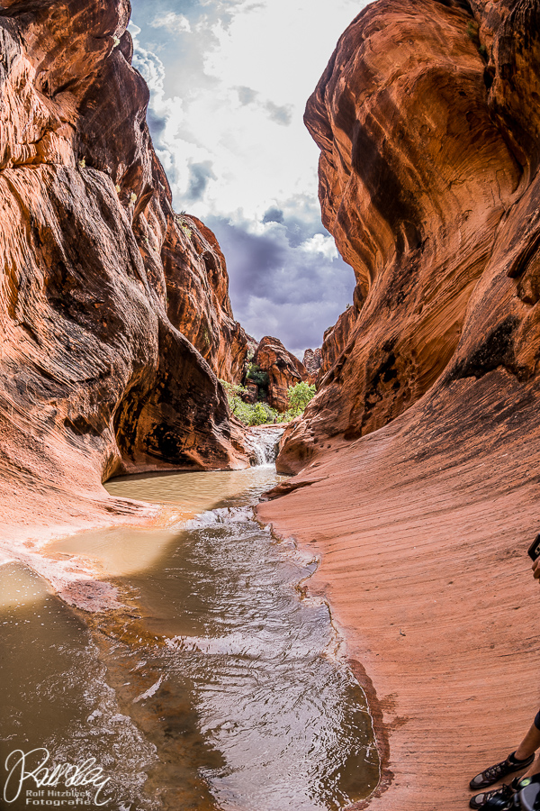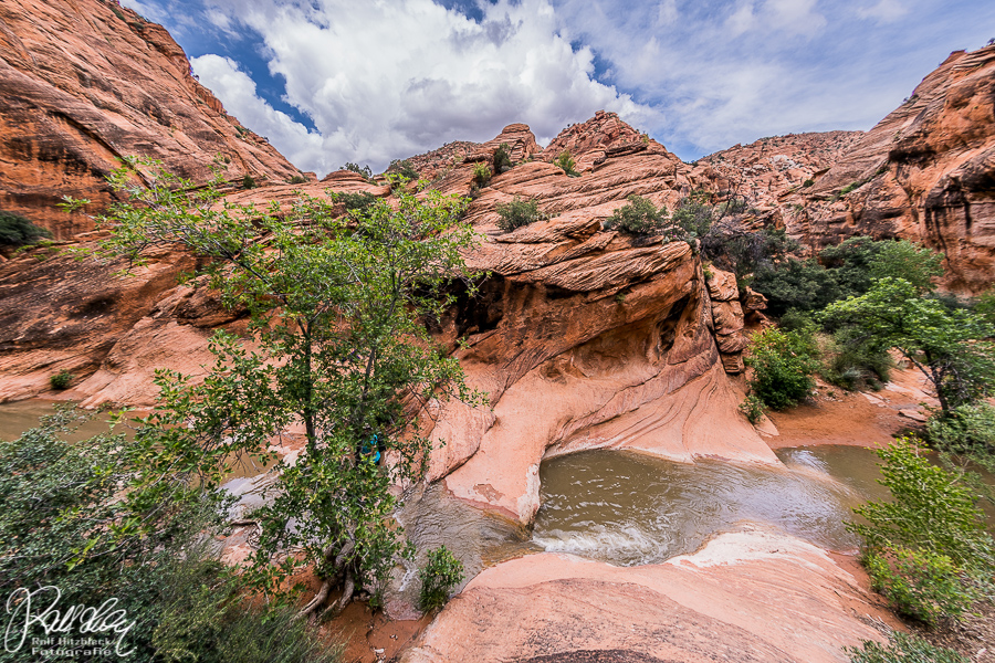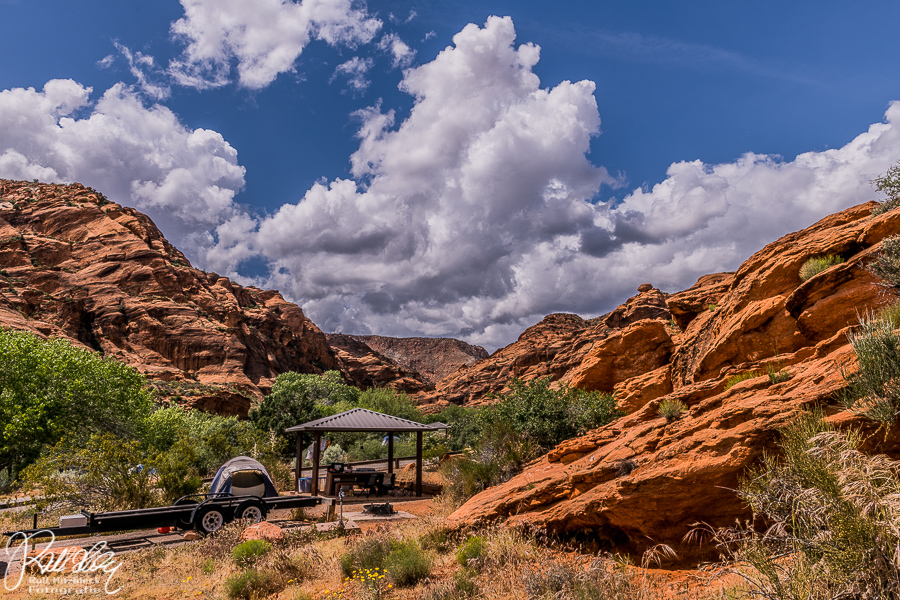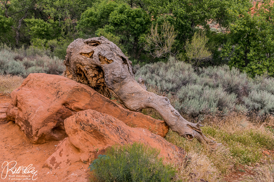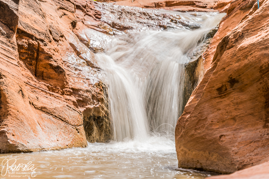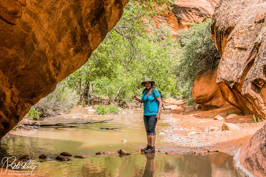Wir hatten noch ein wenig Zeit, also beschlossen wir, auf dem Rückweg noch einen Abstecher in die Red Cliffs Recreation Area zu machen. Aus früheren Urlauben wussten wir, dass dass man dort schön am Fluss entlang bis zu einem Wasserfall und an diesem vorbei laufen kann. Und nach den Erfahrungen vom Gunlock Reservoir nahmen wir an, dass der Fluss mehr Wasser führen dürfte als bei früheren Urlauben.