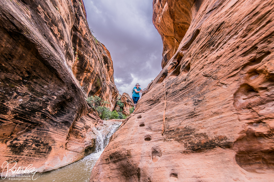 Auf dem Rückweg schaffte es meine Göttergattin dann doch noch, sich beim Herabklettern mit dem Allerwertesten ins Wasser zu setzen. Aber das war nicht das einzige feuchte Trauma, was sie erlebte. Es fing so richtig schön an zu schütten und als wir den Parkplatz erreichten, waren wir bis auf die Haut nass. Meine Mutter, die es sich an der Picnic Area gemütlich gemacht hatte, stand zum Glück etwas trockener unter Bäumen. Beim Einladen schaffte ich es dann endgültig, den GPS-Sender von seinem Fuß abzureißen. Mist. Also auf dem Rückweg kurz zum Walmart reinsprinten und 2-Komponentenkleber holen.