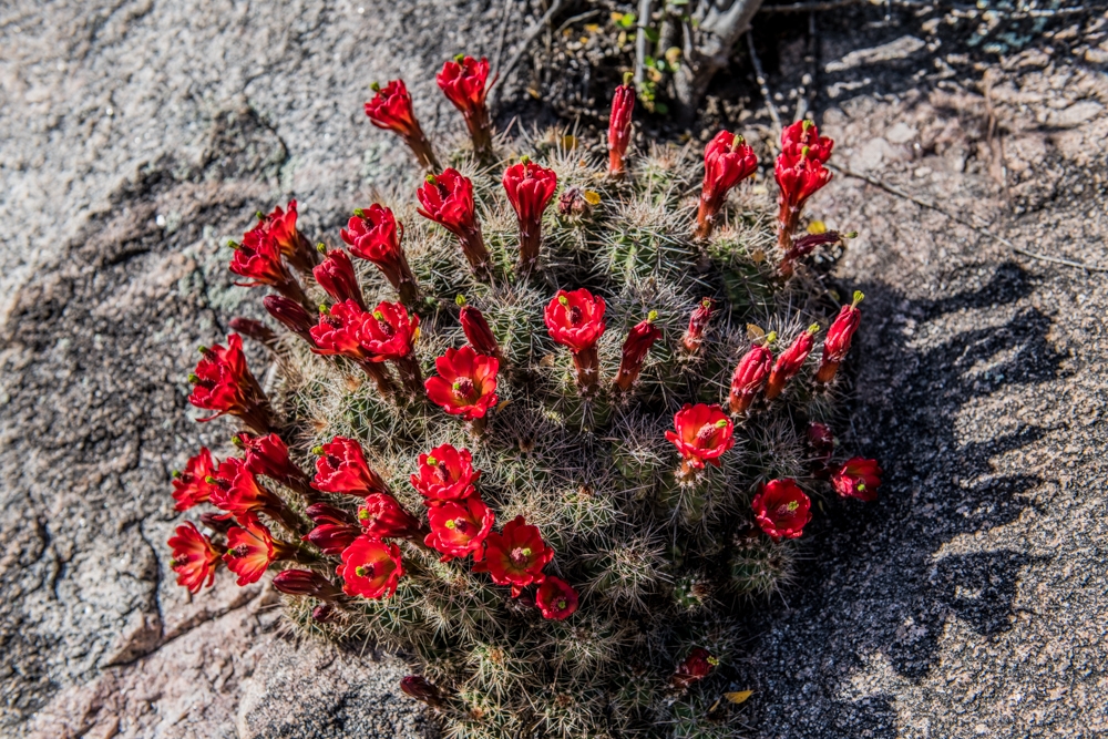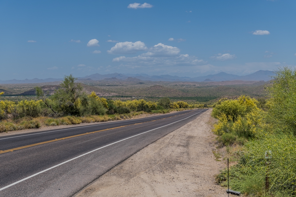 Die Strecke ist „eigentlich“ eintönig, wären da nicht die Kakteen und gelb leuchtenden Büsche, die sich so herrlich gegen den blauen Himmel abheben. Die Saguaro Kakteen sind fast alle in Blüte, ein Schauspiel, an das ich mich die letzten 36 Jahre so nicht erinnern kann.