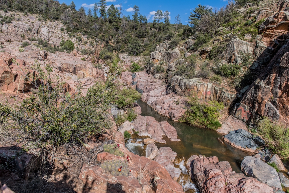 Im nördlichen Payson verlassen wir die Hauptstraße nach rechts auf die Houston Mesa Road, der wir ca. 6-7 Meilen folgen. Schilder, die auf den Kauf des Tonto-Passes dringend hinweisen, ignorieren wir geflissentlich. Denn wir haben uns kürzlich im Saguaro NP schon mit dem sg. Interagency Pass eingedeckt. Dieser eröffnet für ein Jahr nicht nur den Eintritt in alle Nationalparks, -monumente und sonstiges „national“. Es werden auch alle möglichen Feriengebiete, hier der Tonto-Rim, aber auch die Sedona-Gegend davon abgedeckt. Nicht eingeschlossen sind State Parks und Regional Parks.