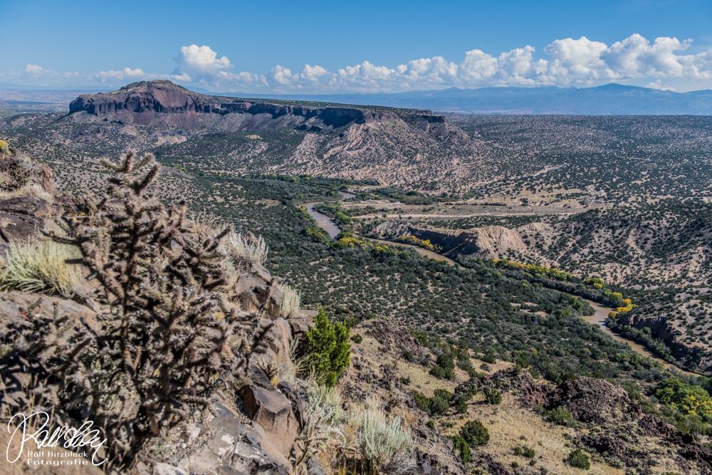 Der Overlook hält, was der Name verspricht: Ein weiter Blick ins Land, zur einen Seite purzeln – dank des schlechten Wetters der vergangenen Tage – Wasserfälle den Berg runter. Im Tal fließt träge der Rio Grande durch sein Bett.