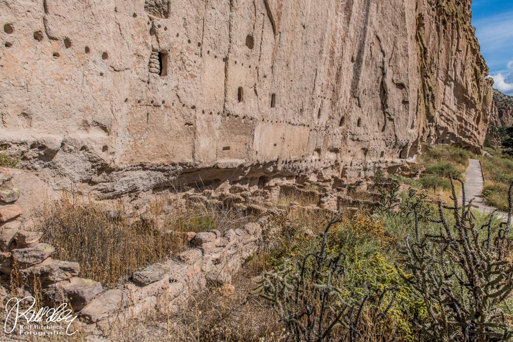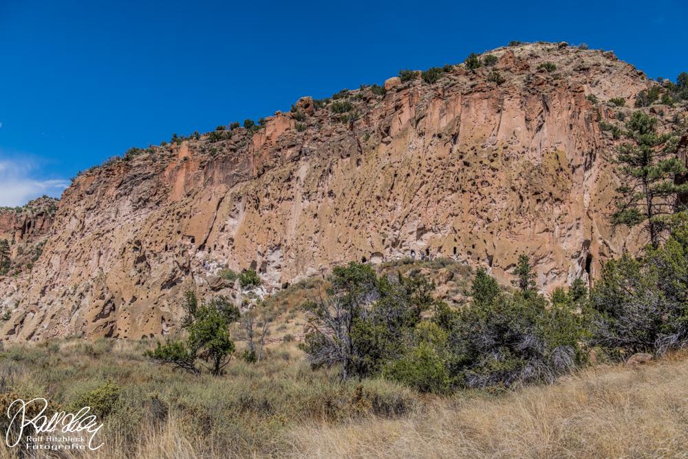 Wir entschließen uns für den Pueblo Loop Trail. Er führt entlang an steil aufragenden Felswänden, die von Natur aus schon gelöchert sind wie ein Schweizer Käse.
