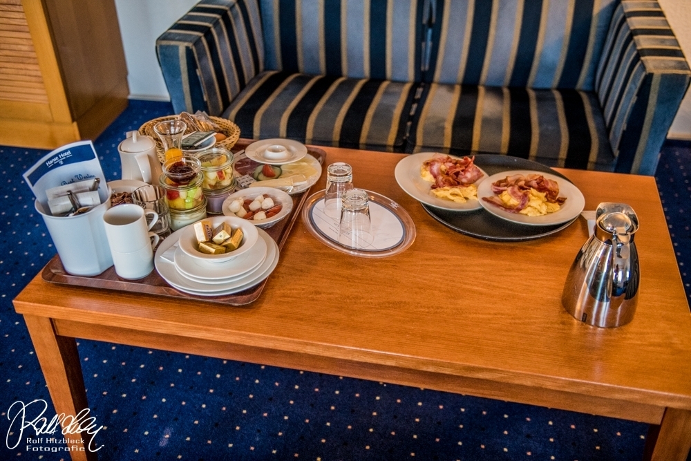 Kommen wir zu unserem ersten Frühstück. Von einem früheren Besuch wussten wir, dass das Frühstücksrestaurant ein langer schmaler Schlauch war, im Normalfall kein Problem, zu Corona-Zeiten schon. Deshalb mussten wir unser Essen vorbestellen, welches dann an einem Tisch bereitgestellt würde, um den Publikumsverkehr auf ein Minimum zu beschränken. Und eine Uhrzeit wurde uns auch angeboten. 7.45 Uhr + 45 Minuten.