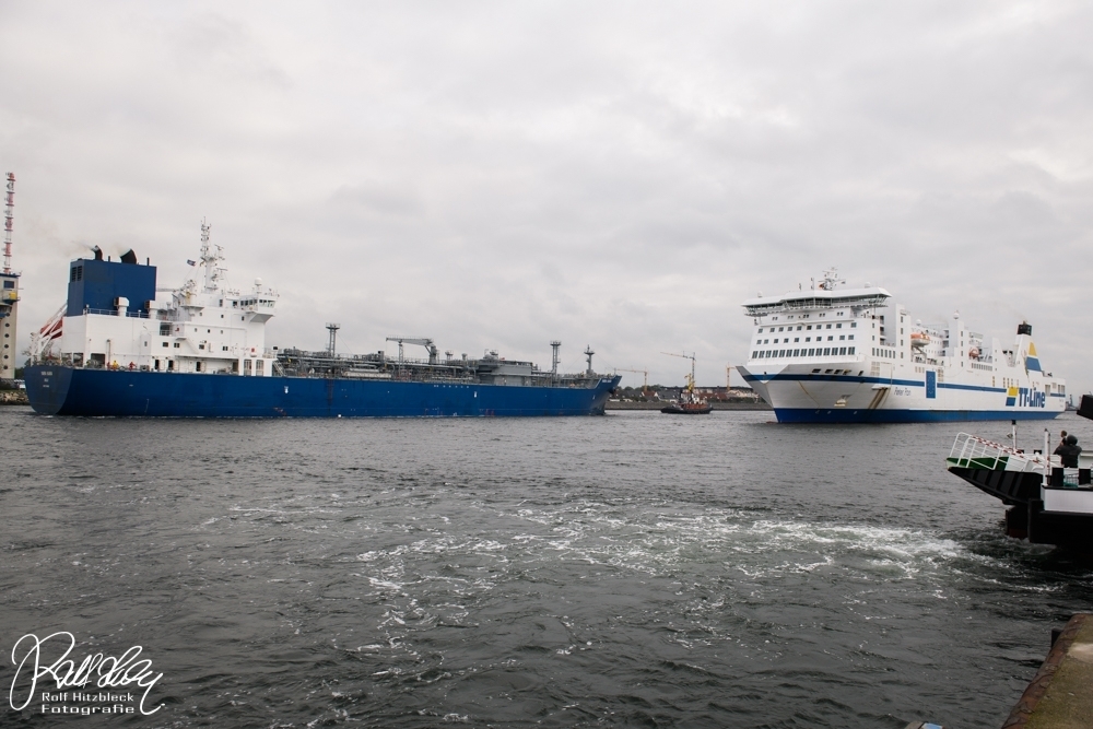 Als der Regen dann wärmer wurde, stapften wir durch den Hafen bis zur Warnow, wo die richtig großen Pötte ankamen.