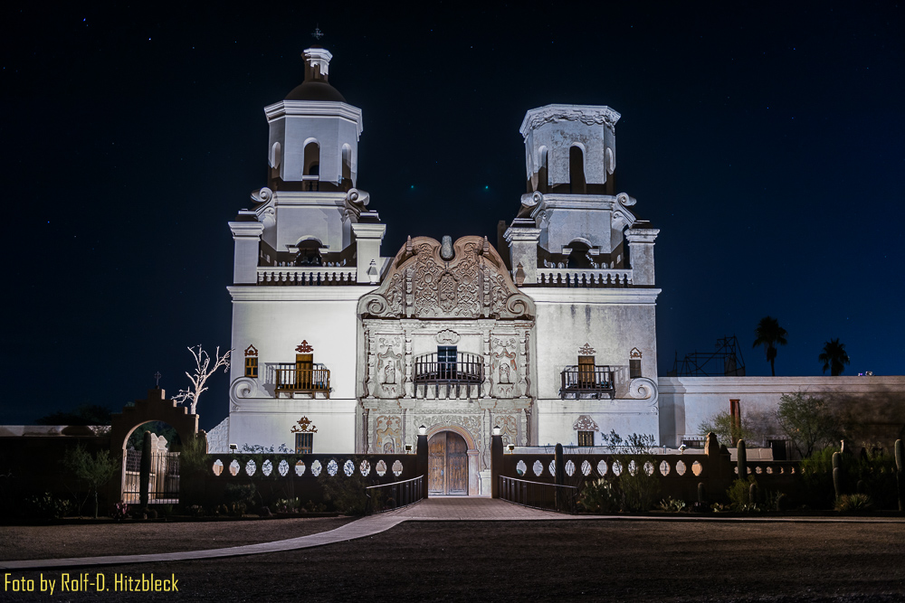 Einen Stop musste ich noch einlegen: Links der Autobahn (übrigens wieder mit einer Border Patrol) sah ich die Mission San Xavier del Bac hell erleuchtet liegen. Kurz rausfahren und ein Foto von der Kirche machen.