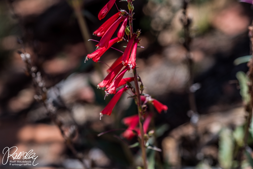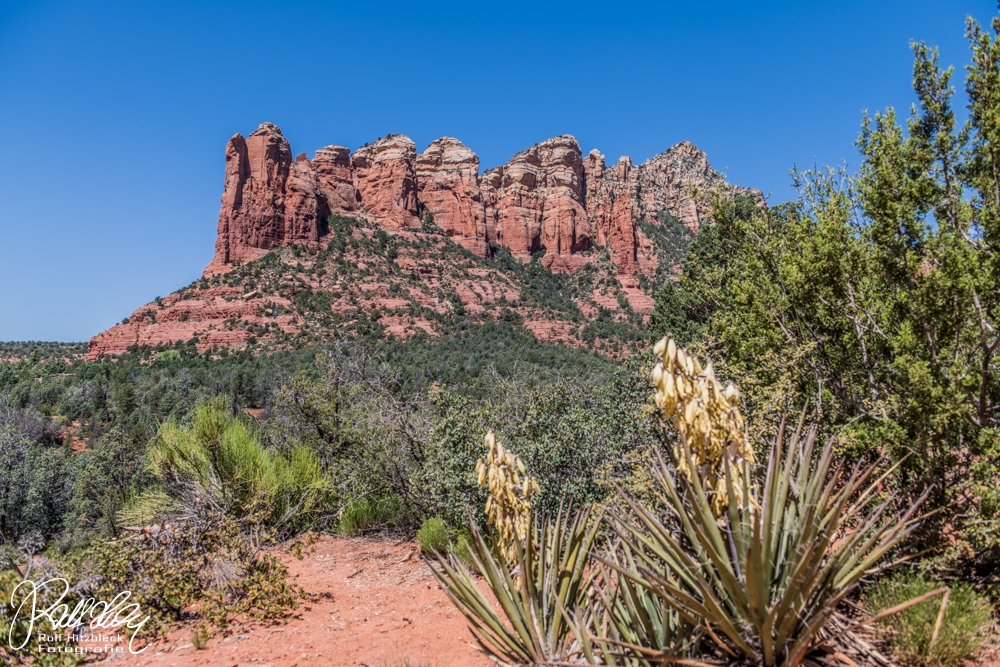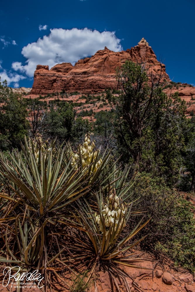Agaven blühten hier (sie hatten die Saguaros abgelöst) und bildeten einen reizvollen Vordergrund zum Grün des Dschungels, dem Rot der Felsen und dem blauen Himmel.