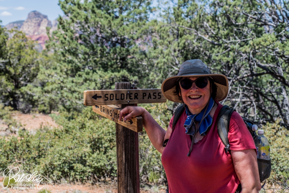 Meine Göttergattin hatte als Wanderung (für uns beide kompatibel, hoffentlich) den Soldier Pass Trail rausgesucht. Schwierigkeitsgrad moderat. Das bezog sich aber nur auf den Trail selbst, nicht auf das Finden eines Parkplatzes. Direkt vor dem Trail ein großes Gitter, der Parkplatz war komplett gesperrt. Etwas weiter weg (ca. 1 Meile) gibt es eine andere Parkmöglichkeit, von der aus ein Shuttle-Bus alle halbe Stunde dahin fährt. Auch dieser Platz war logischerweise voll, aber wir fanden in der Nähe einen Parkstreifen, wo wir unseren Dusty abstellen konnten. Am Straßenrand in der Umgegend ansonsten gibt nur Verbotsschilder in Hülle und Fülle, die Anwohner sind es verständlicherweise leid, überall fremde Autos stehen zu sehen und selbst nicht mehr durchzukommen. Und die Abschleppdienste müssen schließlich auch ihr Auskommen haben.
