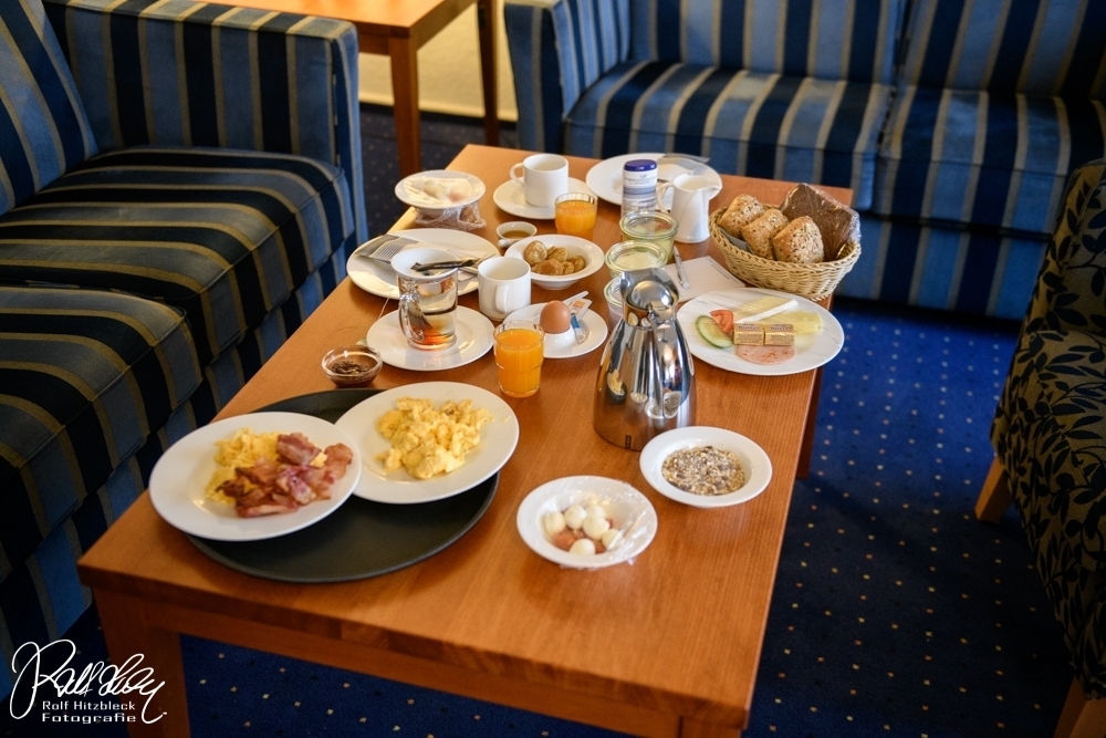 Wir holten uns unsere „Henkersmalzeit“ auf unser Zimmer. Schön eindecken und dann genüßlich mit Blick auf das graue Meer so lange wie möglich genießen.