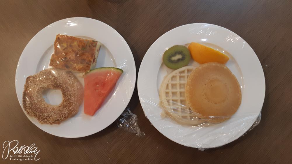 Aber kehren wir zu angenehmeren Dingen zurück. Ab 6.30 Uhr (also für uns schon fast Mittag) gab es Frühstück. Natürlich Corona-konform. Ich entschied mich für einen Teller einer Quiche, einem halben Bagel mit Melone sowie Waffeln/Pancakes. War gut.