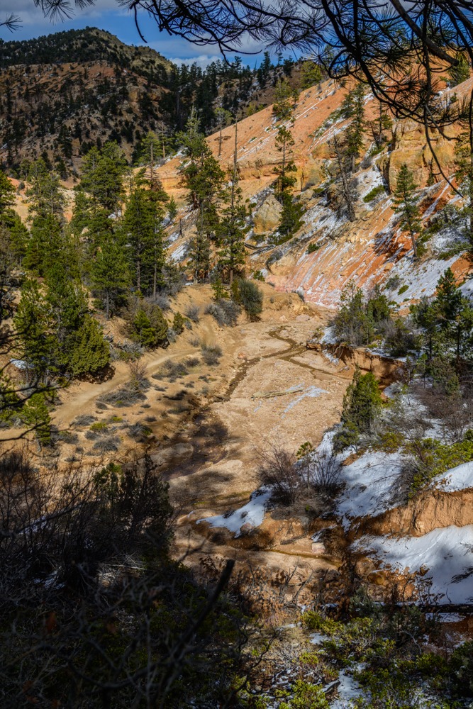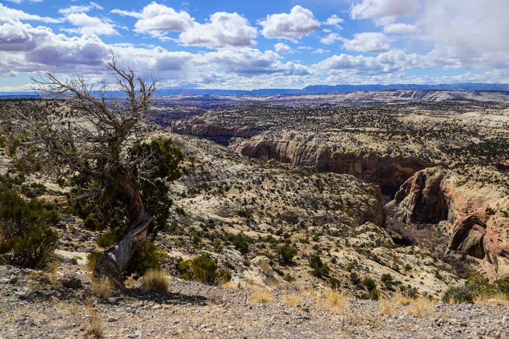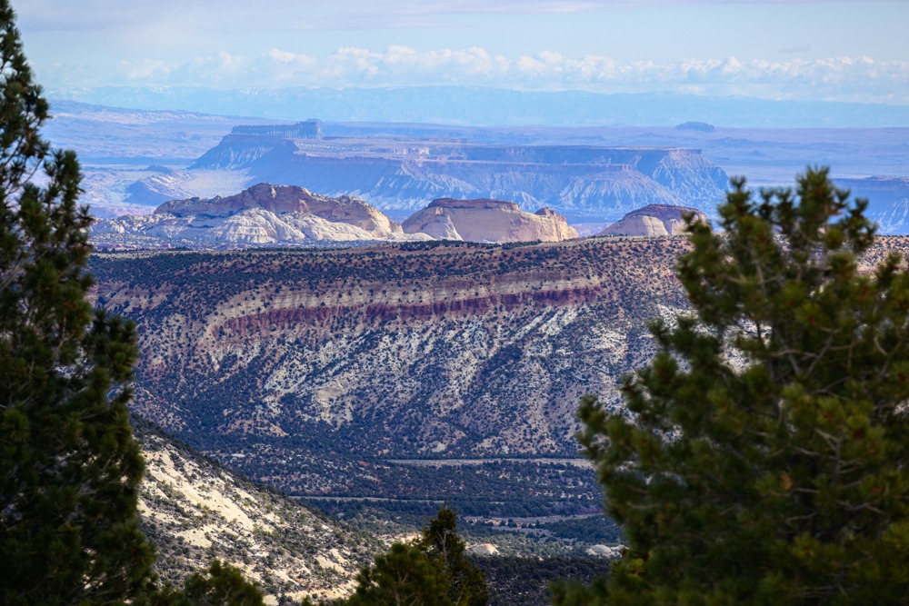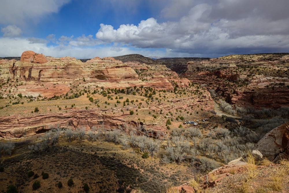 Wir schrauben uns mit dem Auto in die Höhe, die Straße selbst ist schneefrei und wir vermuten, dass mit Split und Salz nachgeholfen wurde. Am Larb Hollow machen wir eine erste Pause und genießen diese unbeschreibliche Landschaft vor uns. Links die Waterpocked Fold mal etwas größer, im Hintergrund die Berge auf dem Weg nach Hanksville, unter anderem die Factory Butte. Die Sonne beleuchtet Teile dessen, was zu unseren Füßen liegt.