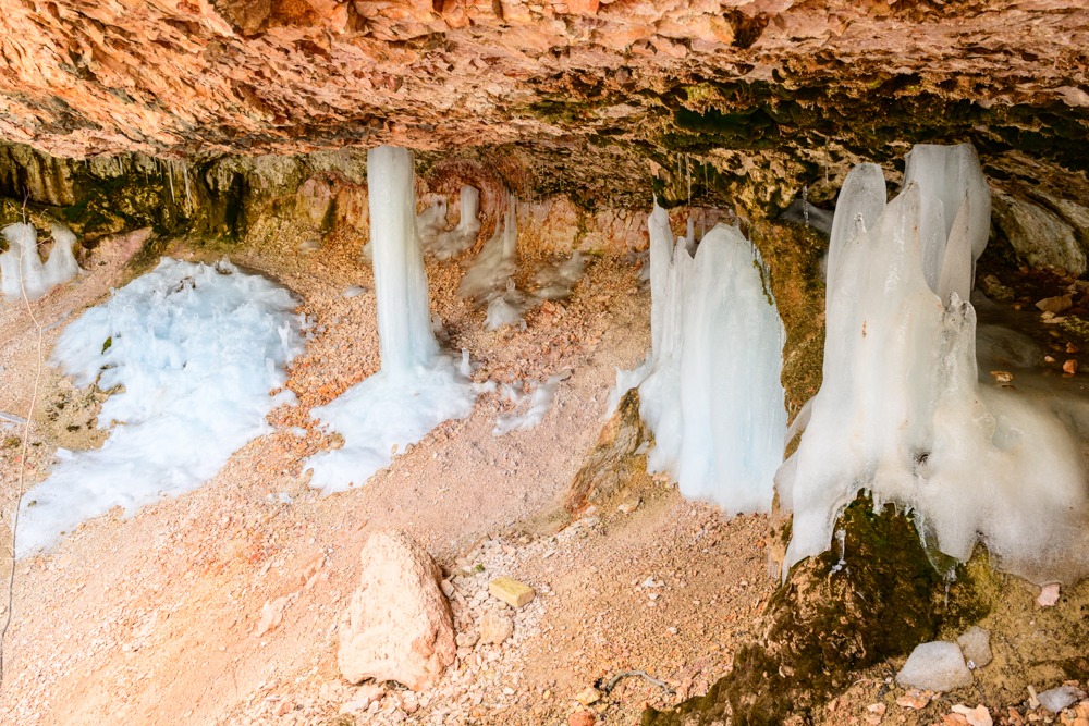 Dort erwartete uns weniger Moos als vielmehr eine Zauberwelt in Weiß. Wasser, das aus Spalten in der Decke tropfte, gefror am Boden schnell zu Eis und brachte diese wunderschönen Stalagmiten und Stalagtiten hervor.