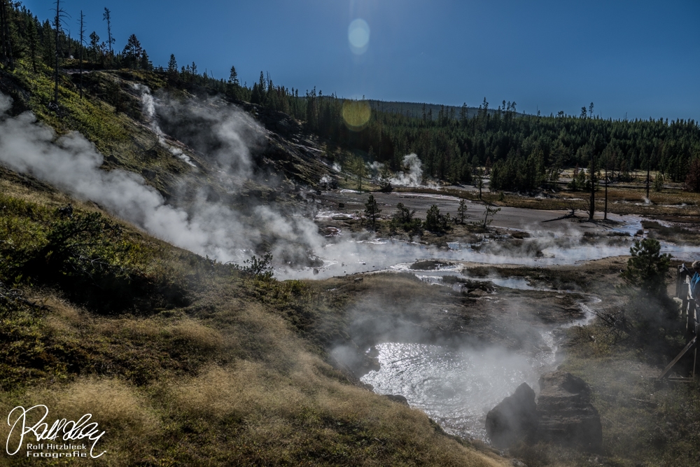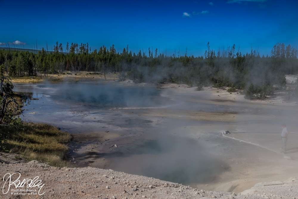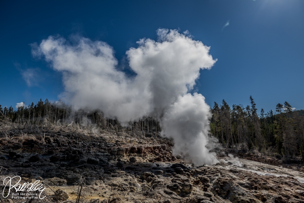 Wir starteten mit der größeren Runde im Back Basin mit dem Steamboat Geyser. Schon imposant, was dieser an Wasser und Dampf in die Luft schleudert.