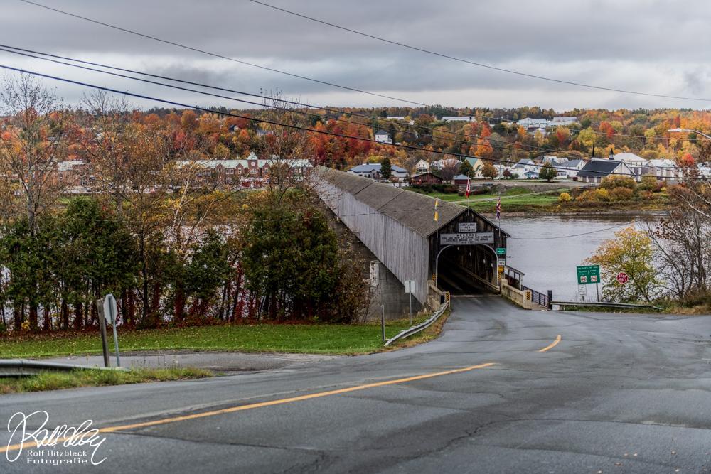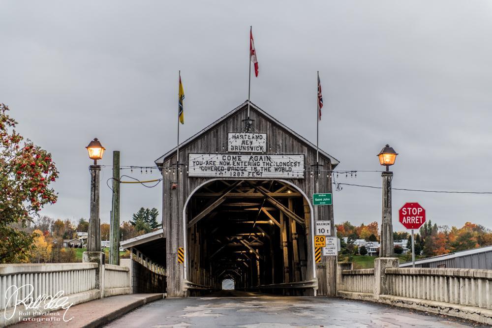 Da es danach immer noch dunkel war, machten wir noch einen Abstecher zu den Wasserfällen in Grand Falls in der Hoffnung, dass diese jetzt (noch) angeleuchtet waren. Aber hier spart man Strom und schont die Umwelt, alles dunkel. Also auf die Piste. Erstes Zwischenziel (s. oben) war die Hartland Bridge im gleichnamigen Ort.