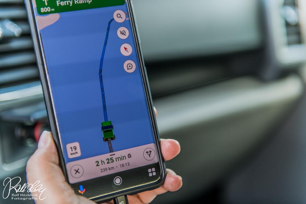 Im Nachgang hatte ich den Verdacht, dass mich meine Beifahrerin nur wegen der Fährfahrt auf die Insel verschleppt hat. Was sie natürlich vehement bestritt. Auf dem Rückweg zum Anleger dachte ich mir, wir schalten bei Google Maps „Fähren vermeiden“ ein schauen, was er dann macht. Lässt uns das Programm bis zum leeren Tank um die Insel fahren?