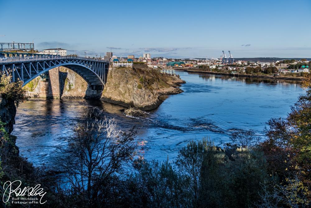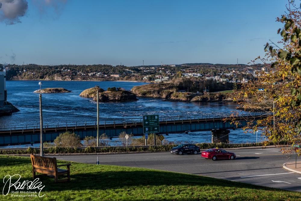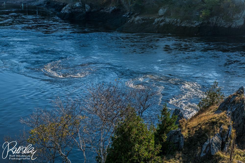Normalerweise strömt der St. John River über Stromschnellen in die Bay of Fundy. Aber bei Flut (wir erinnern uns, großer Tidenhub) drückt das Meerwasser flussaufwärts, so dass sich dort mächtige Strudel bilden (Bäcker hätten ihre Freude dran) und das Wasser die Stromschnellen raufströmt.