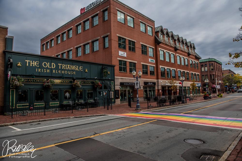 Nebeneffekt: Ein Foto von Downtown Moncton mit Regenbogen-Fußgängerüberwegen.