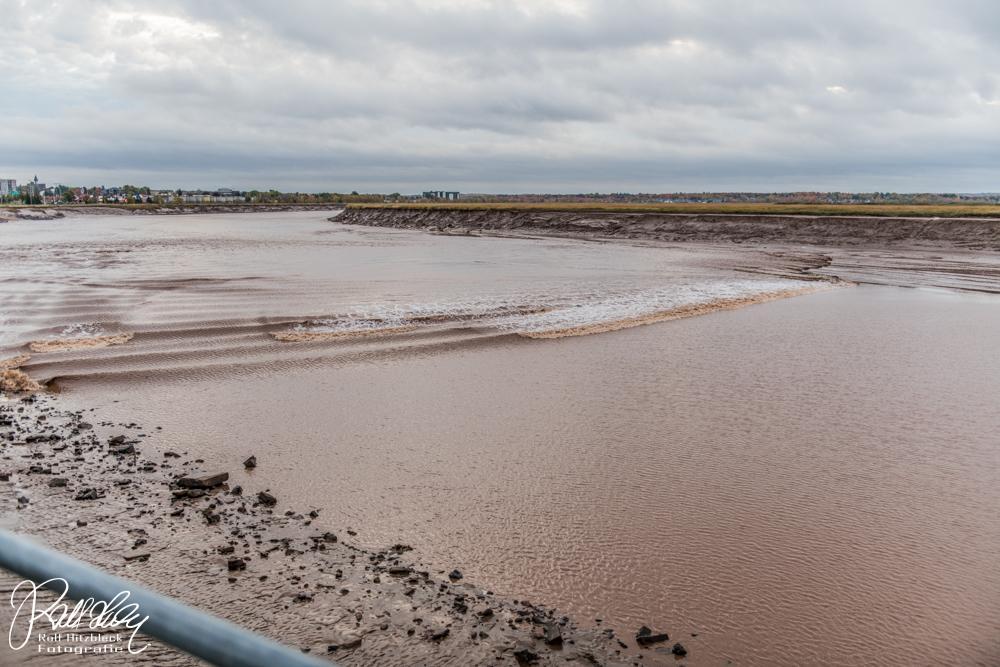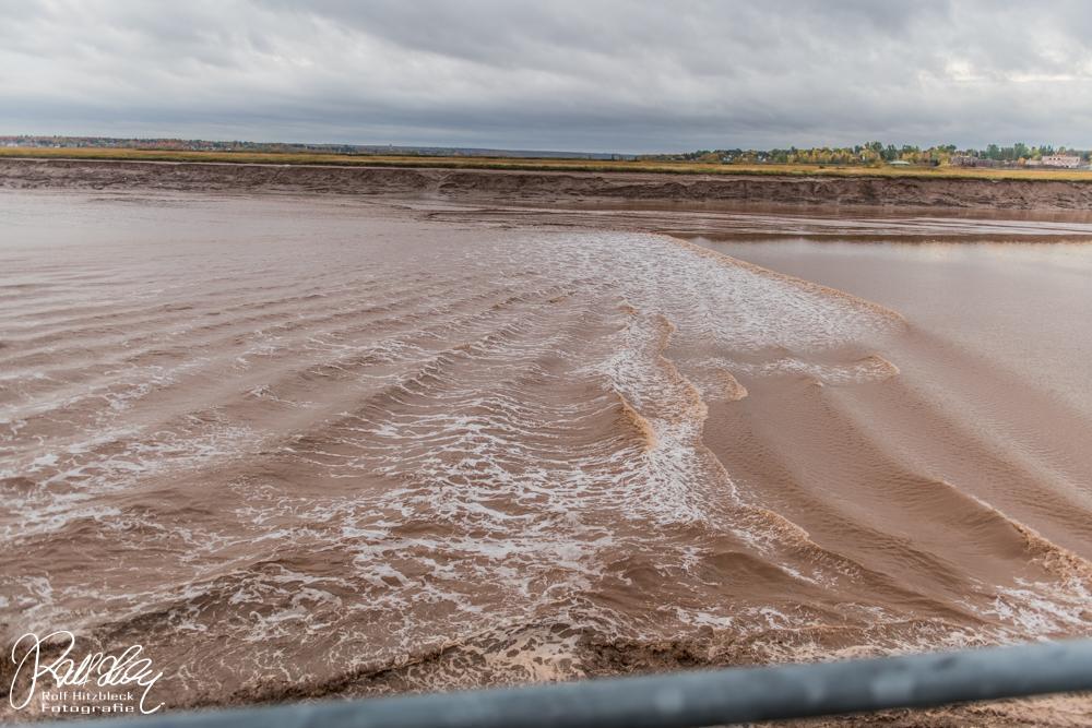 Erstes Tagesziel: The Tidal Bore. Deepl.com übersetzt das mit Tidenbohrung oder auch Gezeitenbohrung. Was verbirgt sich dahinter? Wie schon gestern erwähnt, fließt der Petite Codiac River durch Moncton in die Bay of Fundy. Als wir kurz vor 8 Uhr ankamen, wälzte sich der Fluss träge von rechts nach links durch sein Bett. Schlammige Ufer standen meterhoch im Trockenen. Wir (speziell ich) schauten gebannt nach rechts in Erwartung der Dinge, die da kommen sollten. Und dann schaute meine Göttergattin durch eine Eingebung nach links und da kam sie: DIE WELLE.