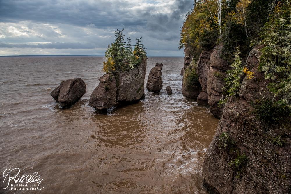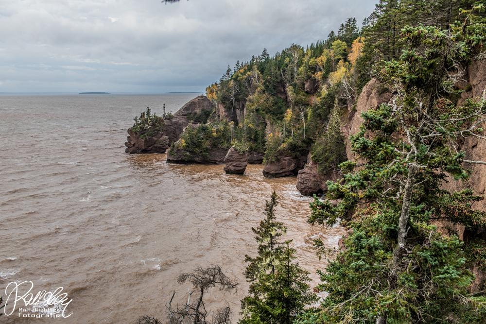 Auf halber Strecke kamen wir – wie schon gestern – an den Hopewell Rocks vorbei. OK, wenn die Flut soeben mit voller Kraft den Fluss nach Moncton raufgeströmt ist, wie sieht es dann bei den Felsen aus? Wir nahmen diesmal nicht die gestern verwendete Zufahrt, weil die Rampe schätzungsweise sowieso unter Wasser stand, sondern gingen direkt den Höhenweg, um das Schauspiel von oben zu bestrachten. Schon faszinierend, dass wir gestern auf dem Meeresboden entlangspazieren konnten, wo heute meterhoch die Wellen an die Felsen schlagen. Reversing Tide.