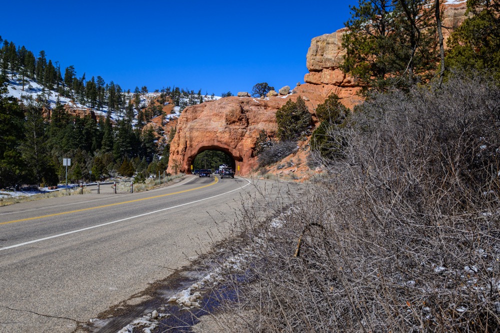Schön leuchten auch hier die Felsen in der Sonne und als besondere Attraktion gibt es zwei Felsendurchbrüche für die Straße, die dann als Red Canyon Arch gefeiert und so bei Google Maps hinterlegt sind.