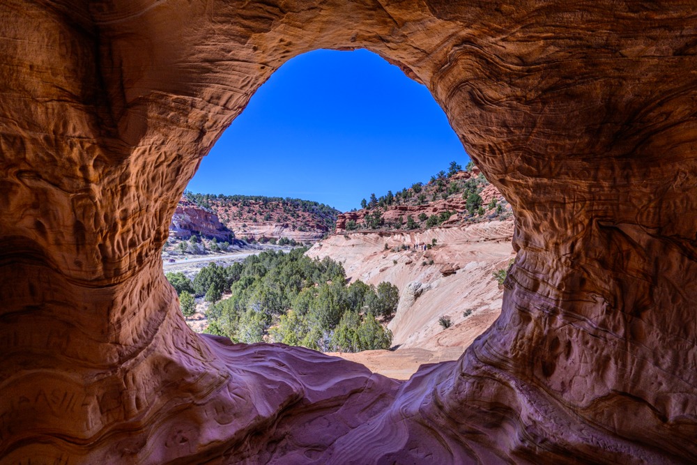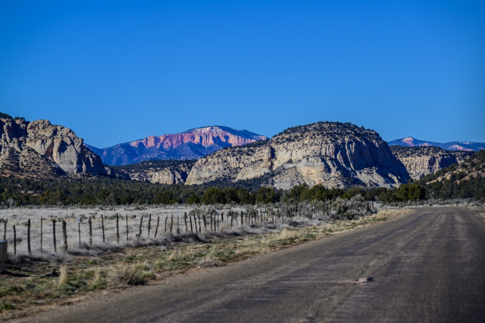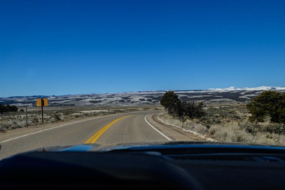 Noch ist reichlich Zeit, bis wir in Kanab ankommen müssen (bzw. dürfen). Knapp 90 Minuten Fahrzeit liegen vor uns, also können wir ein wenig abschweifen. Wir verpacken unser Reisegepäck im Auto (heute Nacht war es sehr kalt, vermutlich so um die -13°C). Aber da es nicht neu dazu geschneit hat, blieb mir das Eiskratzen erspart.