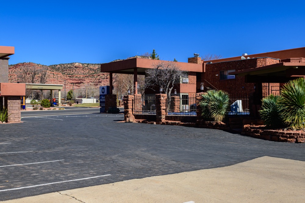 Kurz vor Kanab wurden die Felsen dann wieder interessanter und röter und bald standen wir gegen 13 Uhr vor unserem Hotel. Die Angestellte war noch nicht so erfahren wir ihr Manager-Kollege und wollte uns für das Early Checkin 20 USD abknöpfen. Aber der Chef erkannte korrekt unseren Status und begrüßte uns als „Supergäste“, die natürlich ein Early Checkin ohne Aufpreis erhalten. Auch war er in der Lage, unsere Travelcard von 50 USD (die wir schon zum zweiten Mal in diesem Urlaub durch glückliche Fügung erhalten hatten) einzulösen, so dass uns die erste Nacht etwas über 20 USD kostet. Damit kann ich leben.