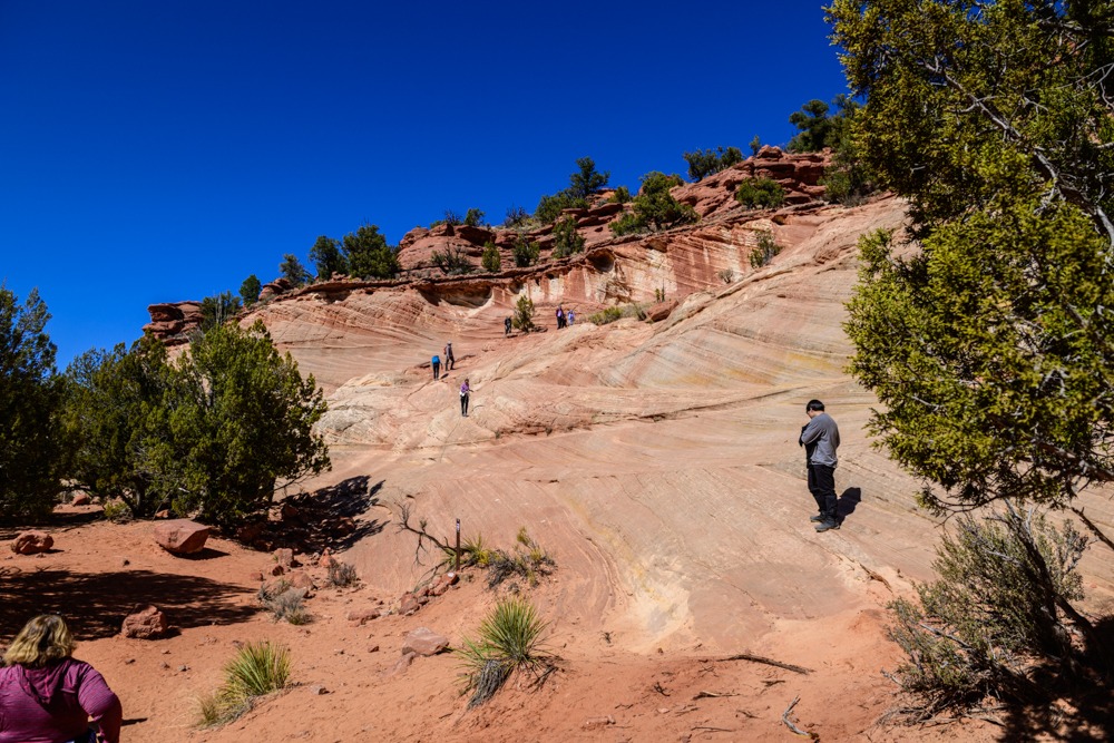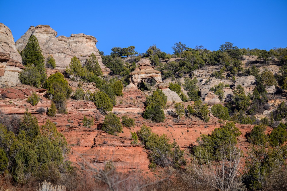 Auf einen Spaziergang auf einem der Wanderwege verzichten wir und fahren gemächlich auf der 12 nach Westen, bis wir auf die 89 nach Süden abbiegen, welche uns jetzt eine ganze Weile begleiten wird. Kurz nachdem wir am Bryce den Kreisverkehr (ja, sowas haben die auch hier) hinter uns gelassen haben, tauchen wir erneut in rote Felsen ein. Es ist die Red Rock Canyon Area, verwandt mit dem Bryce Canyon, aber nicht verschwägert. Hier kann man auch Wanderwege durchlaufen und mittlerweile sind auch Radwege vom Bryce Canyon aus gebaut worden.