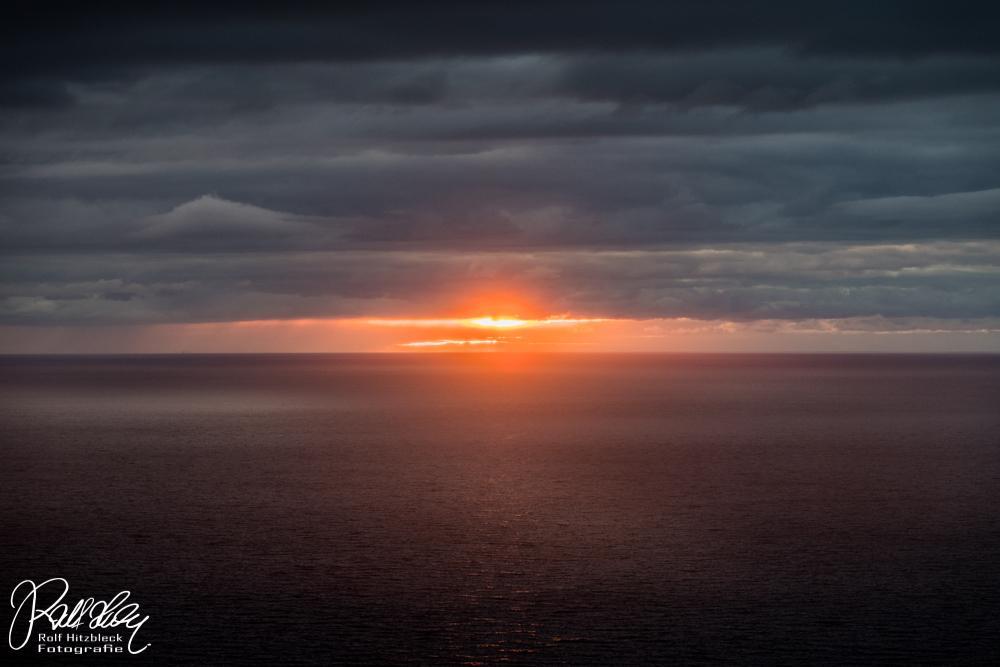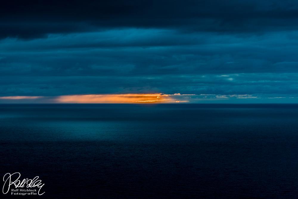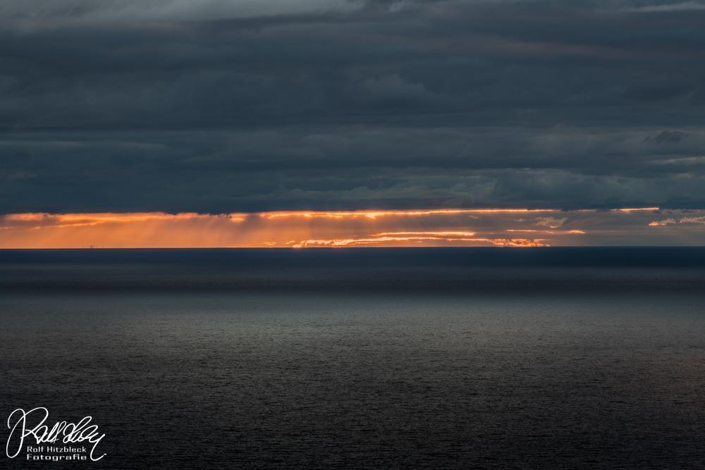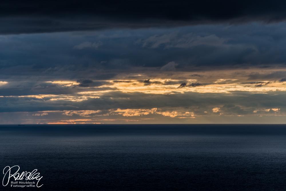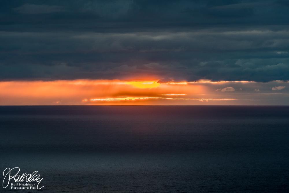 Die Sonne sinkt tiefer und taucht das Meer in ein eigenartig diffuses Licht. Ganz bekommen wir den Sonnenuntergang nicht mit, dazu sind zuviele Wolken davor.
