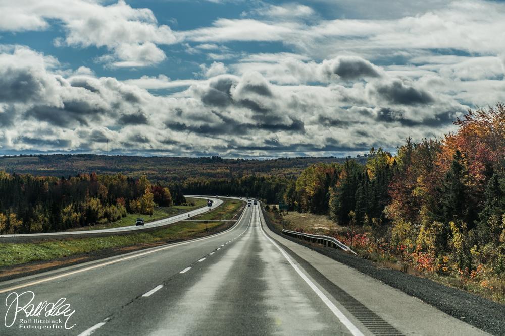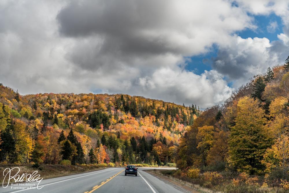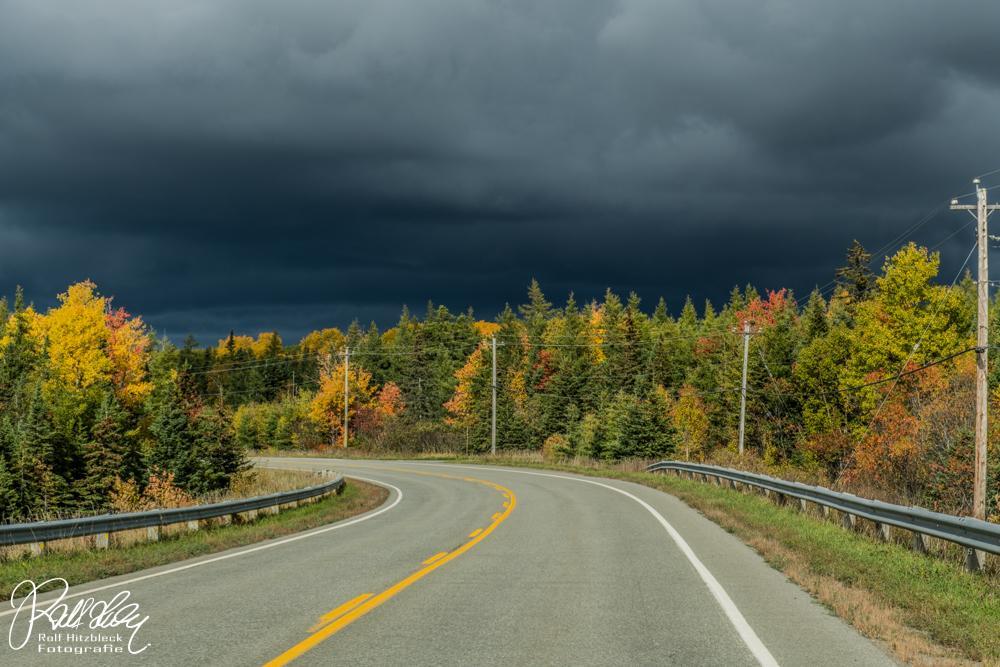 Weiter geht es Richtung Norden. Eine drohende schwarze Wolke bietet einen tollen Kontrast zu den bunten Bäumen. Hoffentlich entlädt die sich nicht, während wir wandern.