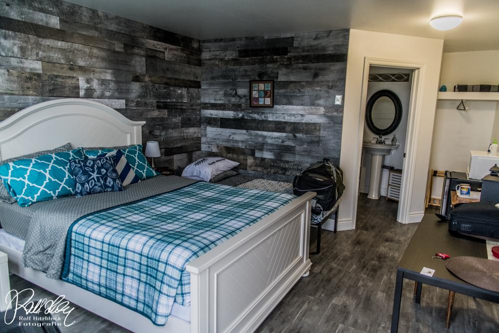 Karin zückt ihr Handy, aber dieses findet keinen Provider. Suuuper. Ich mache mich also auf den Weg zum Nachbarhaus. Dort wohnt die Besitzerin des Etablissements und freut sich wie eine Schneekönigin, dass wir angekommen sind. Sie zeigt uns zuerst das Zimmer, was für uns vorgesehen war. Aber da ein Gast abgesagt hat, könnten wir auch ein etwas größeres bekommen. Total süß eingerichtet. Hier werden wir uns wohlfühlen. Wenn wir denn länger blieben.