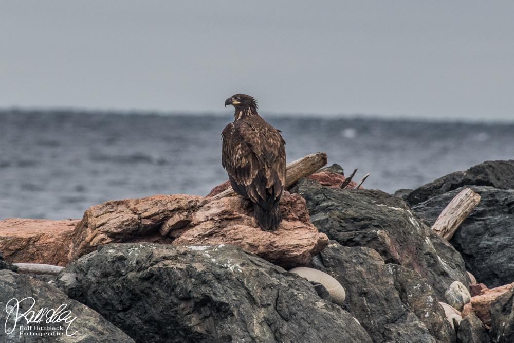 Auf der Mole am gegenüberliegenden Ufer hatte sich dann ein Bald Eagle (ein junger, der Kopf war noch nicht weiß) niedergelassen und ließ sich in Ruhe ablichten.