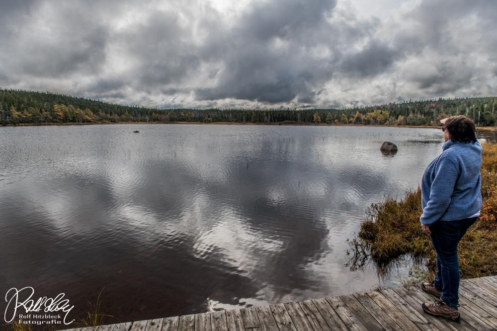 Aber ganz so einfach macht man es den Touristen doch nicht. Man muss sich die Viecher schon erwandern. Am besten über einsame Wege, nicht zuviel reden, um sie nicht zu verscheuchen, und dann sieht man welche. Wenn man Glück hat. Wir fragten in der Ranger-Station nach, wo die Wahrscheinlichkeit am größten sei. Benjie’s Lake sei eine gute Gelegenheit. Und nur ca. 1,5 km für eine Strecke. Am See angekommen, eine schöne Kulisse (Karin hält Ausschau nach Elchen, Koyoten und Walen)