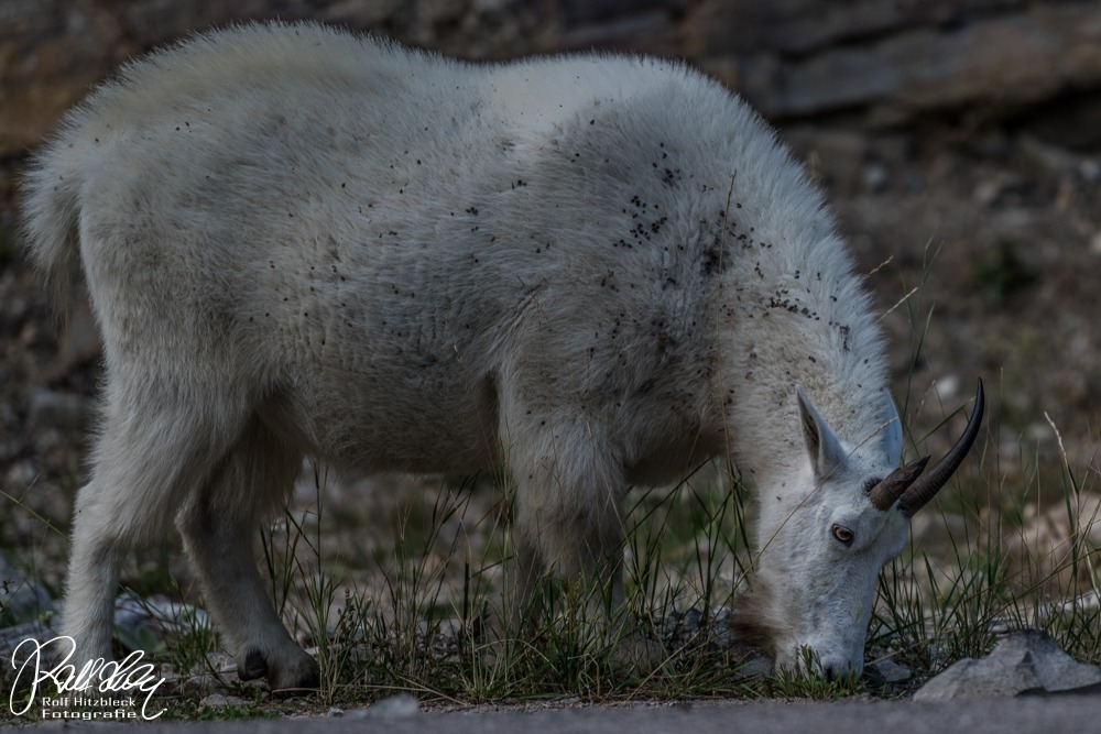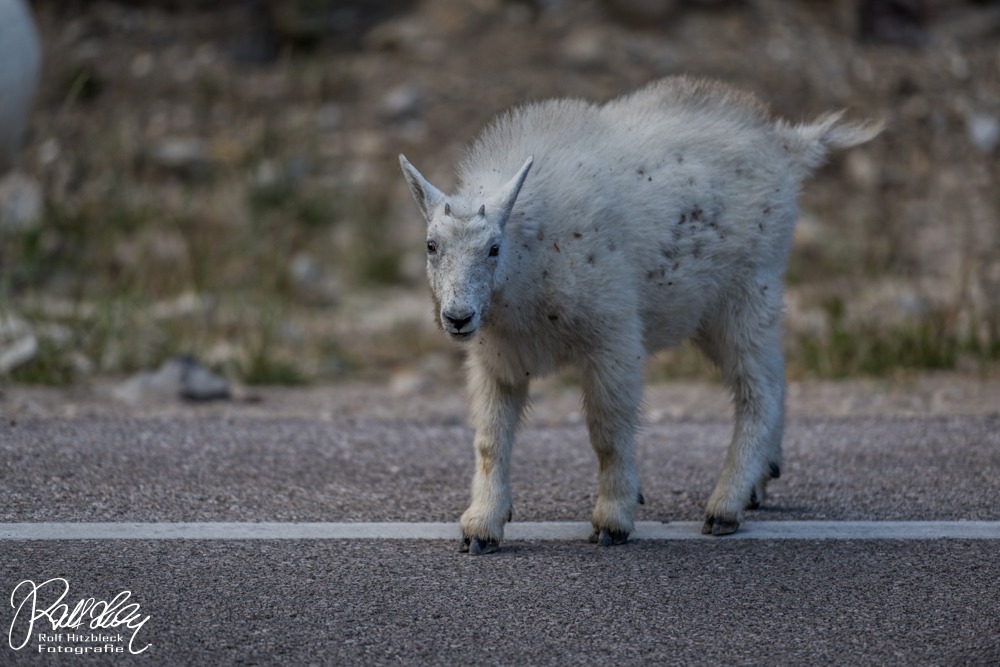 Aber es waren – und da waren wir beide total geflasht – Mountain Goats, Berziegen. Sie waren die extrem steilen Hänge irgendwie runtergeklettert (schließlich sind es ja Bergziegen) und labten sich am Grün des Straßenrandes, darunter auch mehrere Jungtiere.