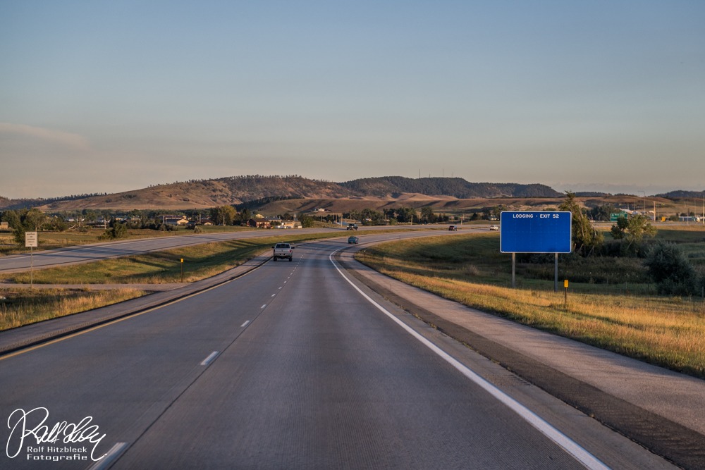 Nach Westen (links) geht es in wenigen Meilen zum Crazy Horse Memorial, etwa die doppelte Strecke nach Osten zum Mount Rushmore National Memorial.