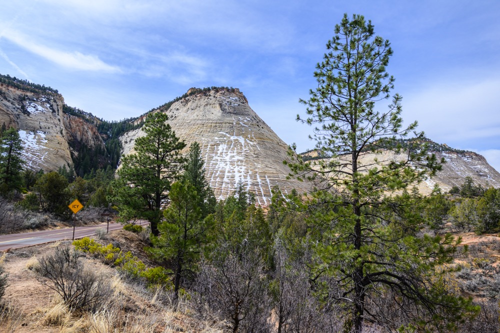 Schon nach kurzer Zeit befährt man den für diesen Park so charakteristischen roten Asphalt und ein obligatorischer Halt ist die Checkerboard Mesa. Von dieser Sorte haben wir so einige gesehen und auch schon erklettert, aber sie ist immer etwas Besonderes, zumal diesmal mit Schnee bedeckt.