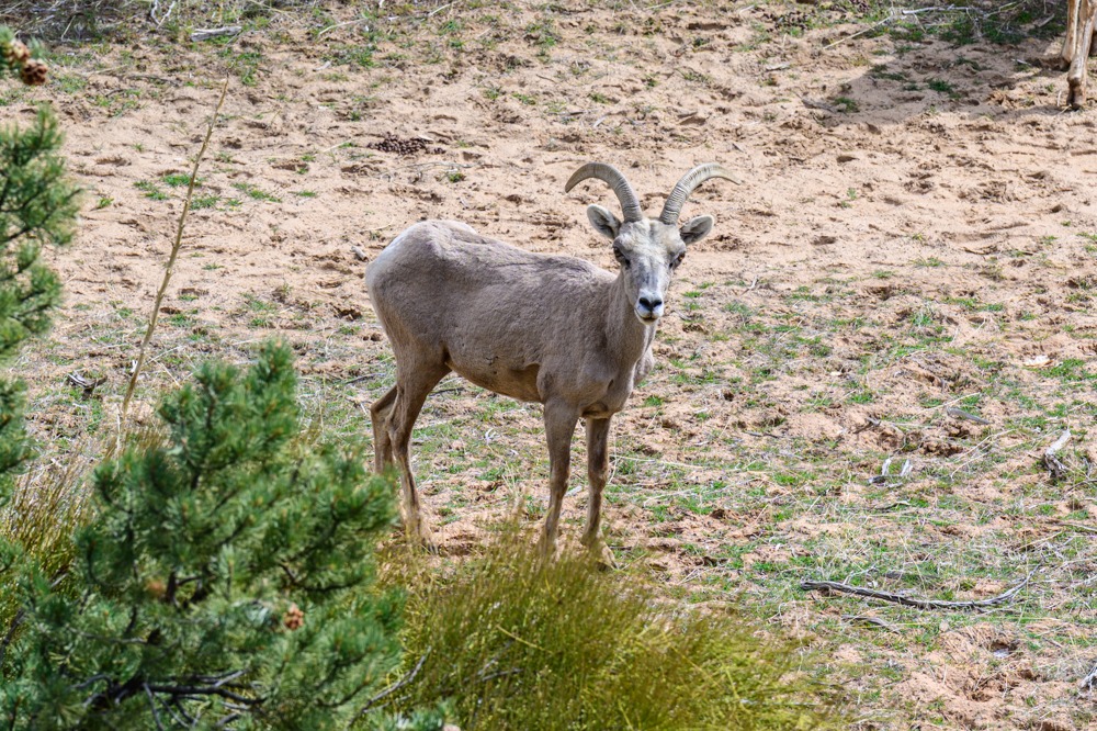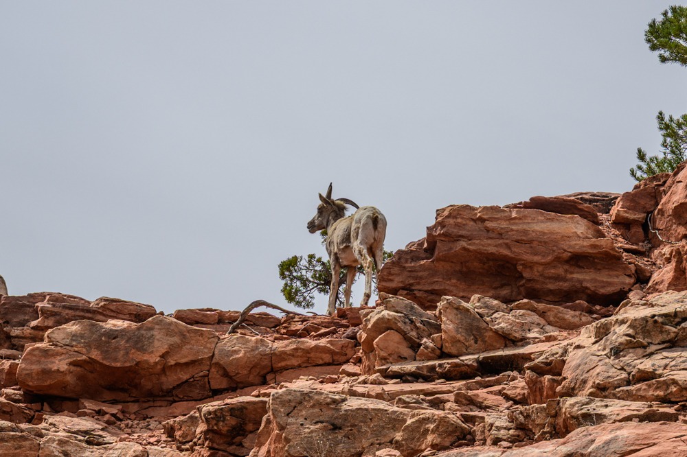 Sie ließen sich nicht durch die Stalker weit oben am Wegesrand stören und so zogen auch wir unserer Wege. Die erste Wanderung war für den Many Pools Trail angedacht, aber der Parkplatz war gerade proppevoll. Also rollten wir gemächlich weiter bis kurz vor den großen Tunnel, wo es auch einen kleinen Parkplatz für den Canyon Overlook Trail gibt. Erwartungsgemäß war auch dieser voll, aber ein kleiner Tourbus füllte sich gerade mit Reisenden. Das konnten wir abwarten und uns in die entstehende Parklücke stellen.