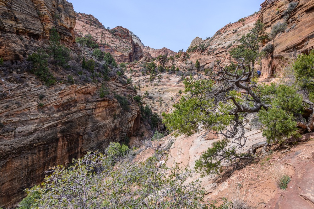 Wir jedenfalls machten uns auf den Rückweg, nur um dabei festzustellen, dass mit Sonne alles noch viel schöner aussieht. Dies ist ein selten schöner Trail, abwechselungsreich, gut zu laufen und wir sind im Gegensatz zum Canyon Overlook kaum Menschen begegnet. Die Insassen der vielen Autos, die den Parkplatz frequentiert hatten, waren in der sicheren Nähe der vierrädrigen Untersätze geblieben.
