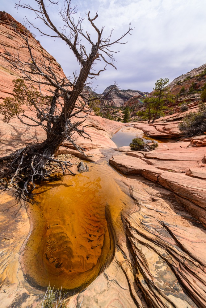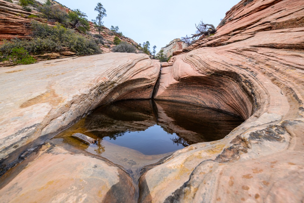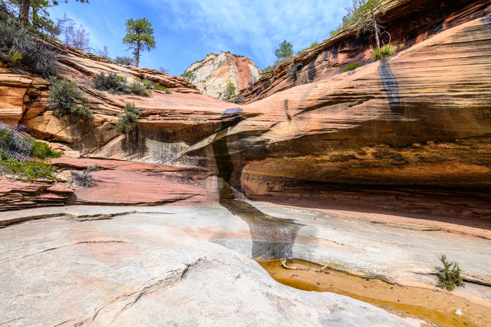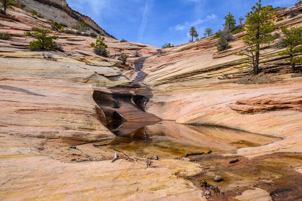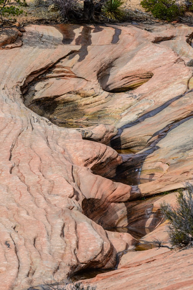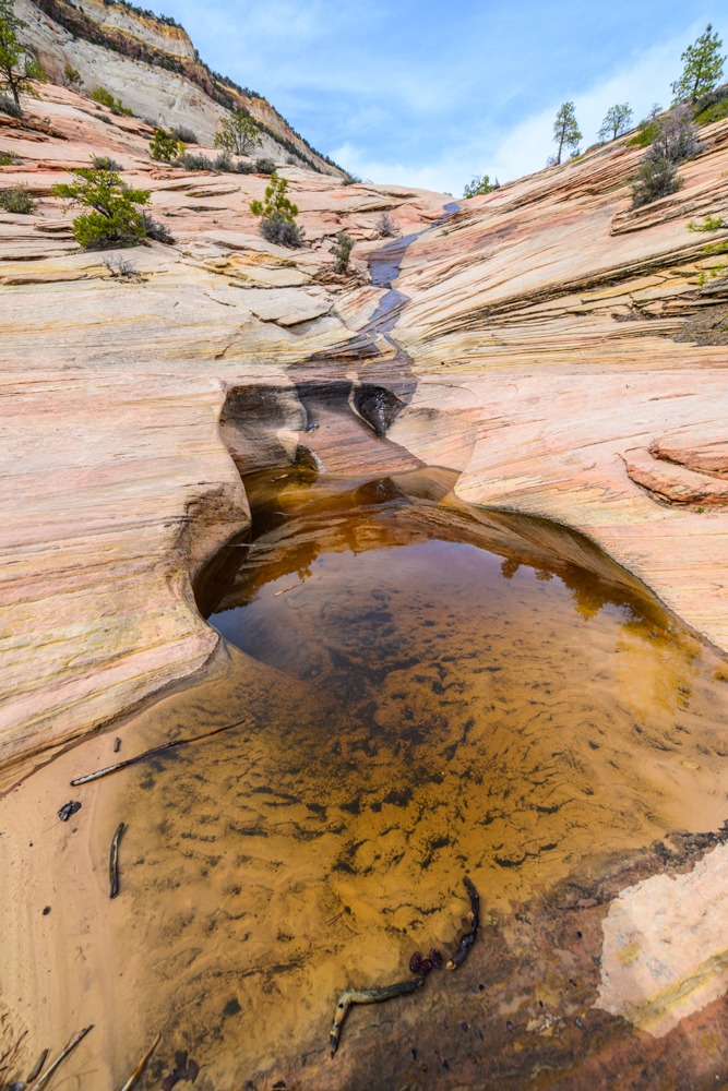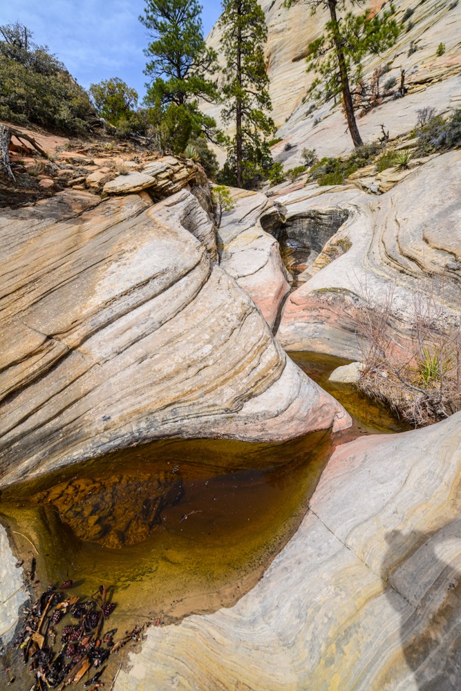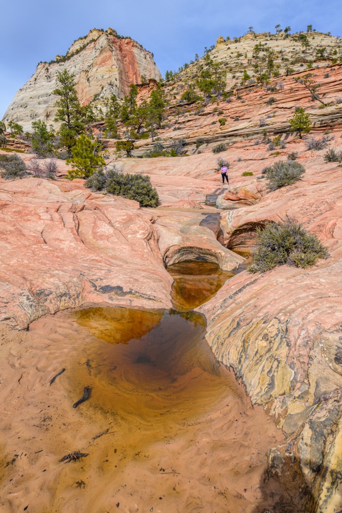 Um zum Trail zu kommen, müssen wir erst ca. 100 Meter entlang der Straße wandern und dann ins Tal abtauchen. Dort geht es zuerst in einem Flussbett entlang. Dann tauchen schon die ersten Pools – in Deutschand hießen sie Gumpen – auf. Gut, dass wir zu dieser Jahreszeit gekommen sind. Ein paar Monate später und der Trail hätte Dry Puddles Trail genannt werden müssen.