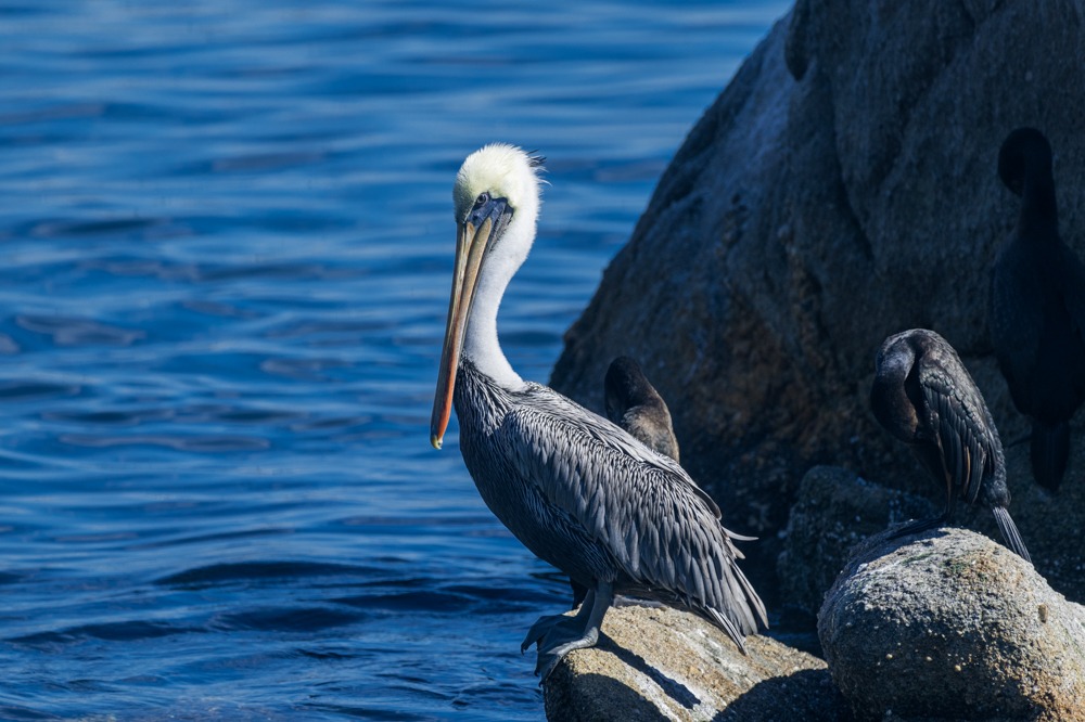 Auch Pelikane stehen majestätisch – oder sollte ich sagen, gelangweilt? – auf den Felsen rum, als könne sie das Gegröle der pelzigen Säuger überhaupt nicht belasten.