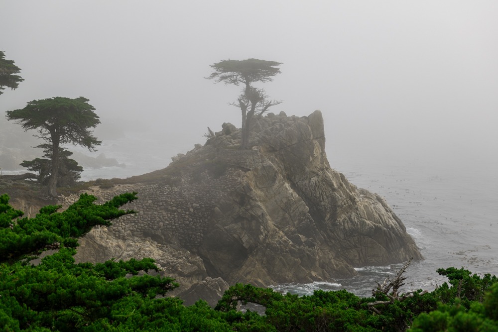 Dann kommen wir zu berümtesten Attraktion des Drives: Der Lonely Cypress. Einsam steht sie auf einem Felsen, der mittlerweile schon untermauert wurde, damit diese Attraktion noch lange bestehen bleibt. Mit Seilen wird sie abgesichert, damit sie weder geklaut noch von einem Wintersturm weggeweht wird. Wir alle kennen diesen markanten Baum bei Sonnenschein. Aber wer hat ihn schon einmal bei Küstennebel gezeigt? Eben keiner. Und das ist jetzt eine der wenigen Gelegenheiten, dieses Bild auf sich wirken zu lassen.