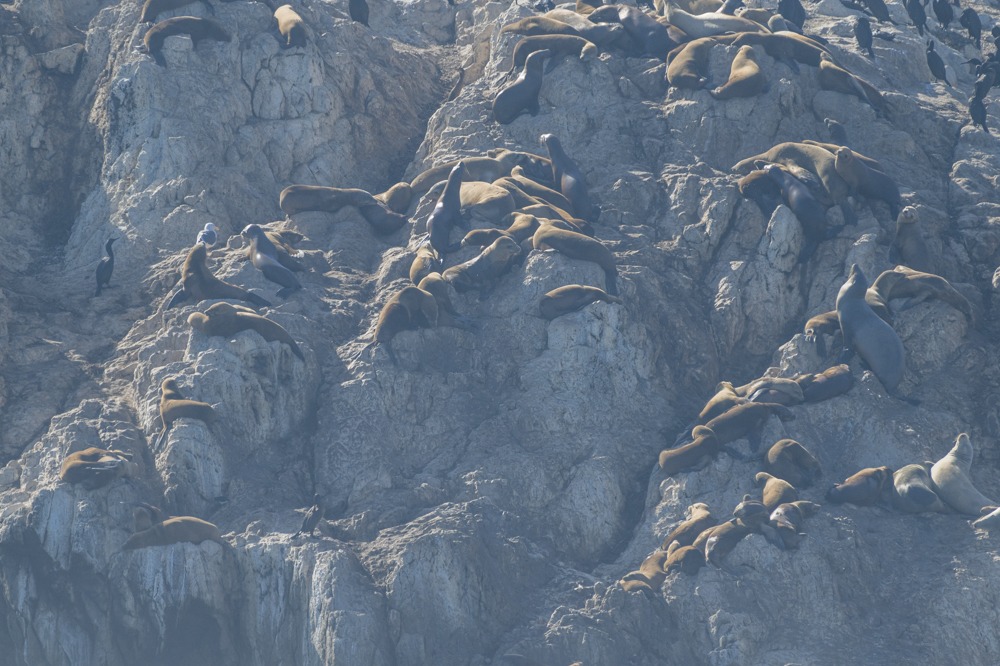 Na ja, wir wissen nicht, wie man abgebissene Finger behandelt. Komplett ungerührt von diesen Fütterungsaktionen sind die pelzigen Meeressäuger gegenüber auf den Felsen. Wobei wir uns fragen, wie die da wohl raufgekommen sind. Ob es einen Aufzug auf der Rückseite gibt?