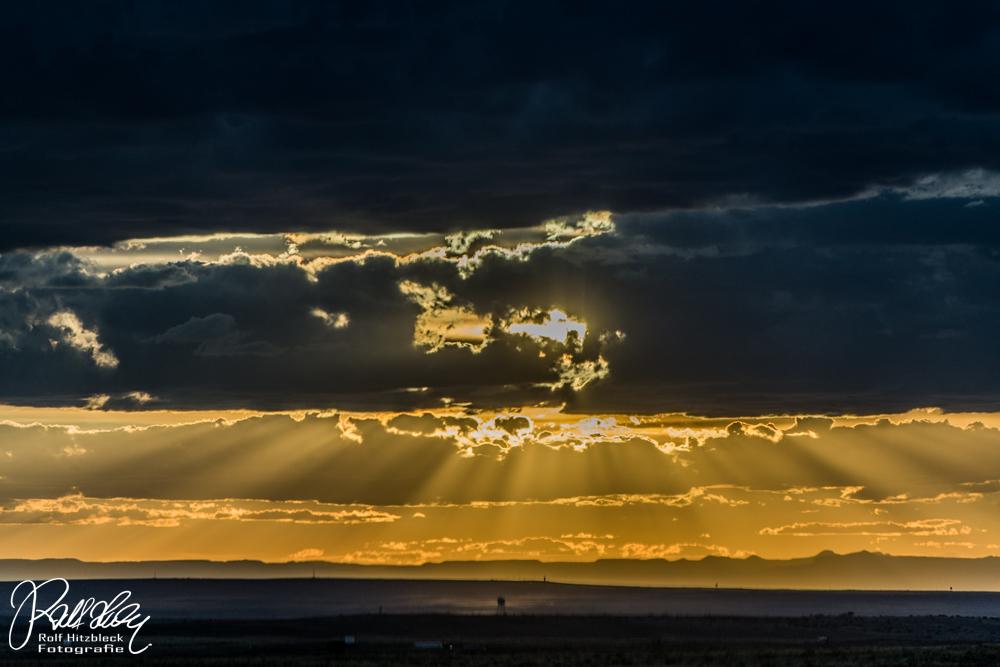 Auf dem Weg zurück (es war eine super ausgebaute Dirt Road, ca. 3 Meilen) schien uns die Abendsonne durch die Wolken und machte einen tollen Sonnenuntergang.