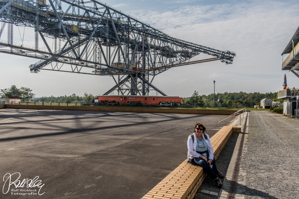 Jedenfalls zeigte ein Schild „Besucherbergwerk F60“ an. F60 erinnerte mich entfernt an einen Ford F150, den ich später mal fahren möchte. Wir bogen ab und ca. eine Viertelstunde später sahen wir einen riesigen Tagebaubagger (wie ich glaubte) aus dem Wald auftauchen. An der Kasse gab es zwei Möglichkeiten: Normaler Eintritt oder mit Führung. Ich watschelte zur besten Höhenkletterin von allen zurück und erläuterte ihr die Optionen. Bevor sie wusste, was sie tat, hatte sie der Führung zugestimmt. Und die nächste Führung begann in fünf Minuten. Passt ja perfekt.